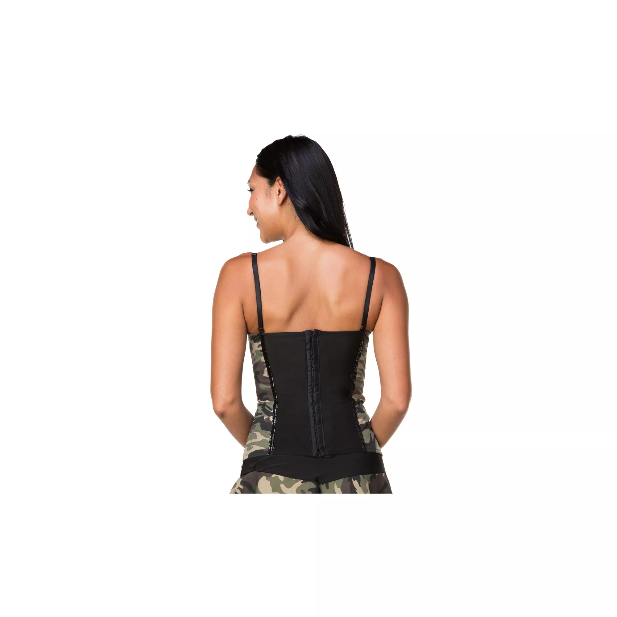 Attention! You'll be getting a lot of it in the Camo Corset. This camouflage print corset features a black sequin detail. Pair this corset with the Camo Skirt (sold separately) for a complete look.