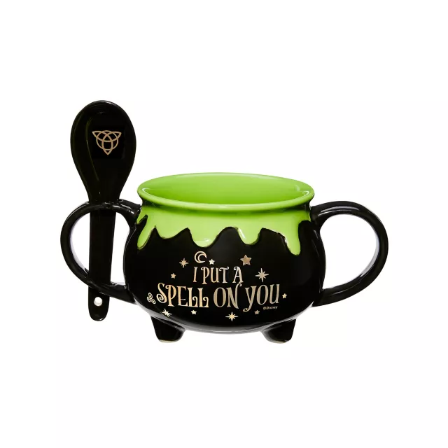 What's brewing in your cauldron? This officially licensed Hocus Pocus mug and spoon set turns any soup or beverage into a fascinating potion! Featuring metallic print that reads, "I put a spell on you," sleek green and black hues, two curved handles, and a printed black spoon, this mug and spoon set is full of spirit.