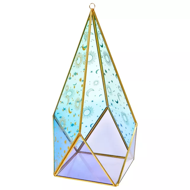 Light all your séances with this adorable Celestial Triangle Candle Holder. This glass candle holder features blue and purple stained glass with gold trim and a celestial pattern design perfect for any witch.