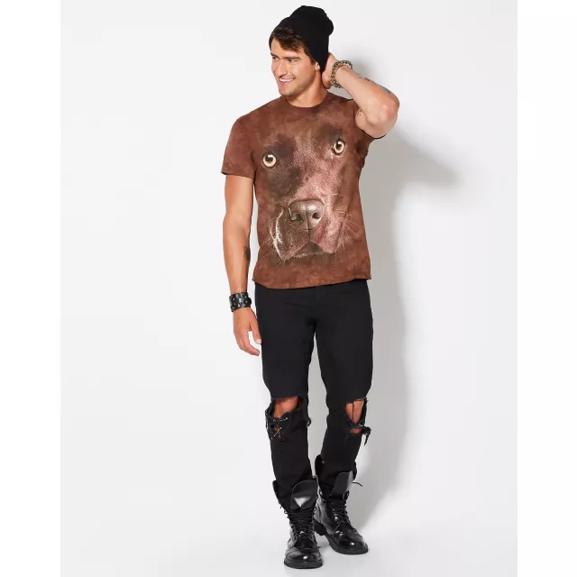 You'll go barking mad for this Chocolate Lab face shirt! The brown tie dye design features an adorable dog's face! Whether you're a dog lover or looking for that easy Halloween look, this Chocolate Lab shirt is paw-sitively perfect!
