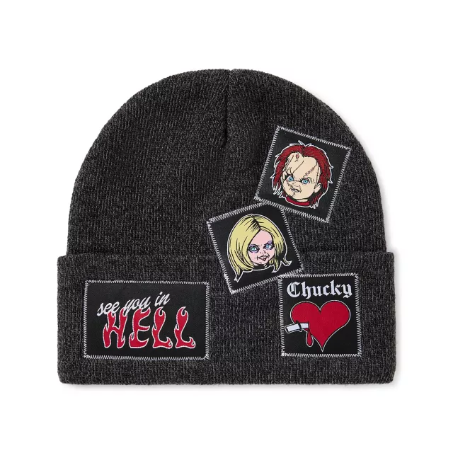 Rock a look that's deviously darling with this officially licensed Chucky and Tiff Patch Cuff Beanie Hat! Made with thick and cozy knit fabric and embroidered patches of Chucky, Tiff, and other movie-inspired graphics, this beanie is so cute it's killer.