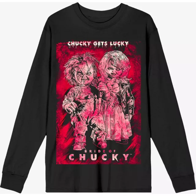 Show love for everybody's favorite couple and add some killer style to your wardrobe when you get this officially licensed Bride of Chucky T Shirt. This long-sleeve tee features an image of Chucky and Tiffany all dolled up. For slasher fans, this top is to die for.