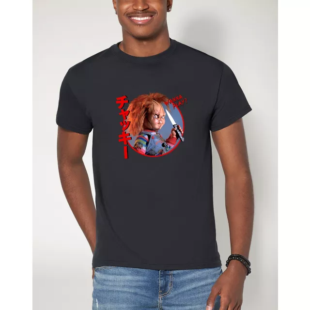 Wanna play? Add a touch of terror to your wardrobe with this Chucky Katakana T Shirt! This officially licensed tee features everyone's favorite dastardly evil doll, Chucky, and is a great choice for any horror fan.