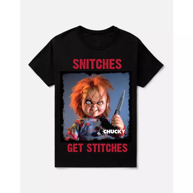 Keep your lips sealed and your look killer with this officially licensed Chucky Snitches Get Stitches T Shirt. This stylish tee will let everyone know that you've got the best taste in horror movies.