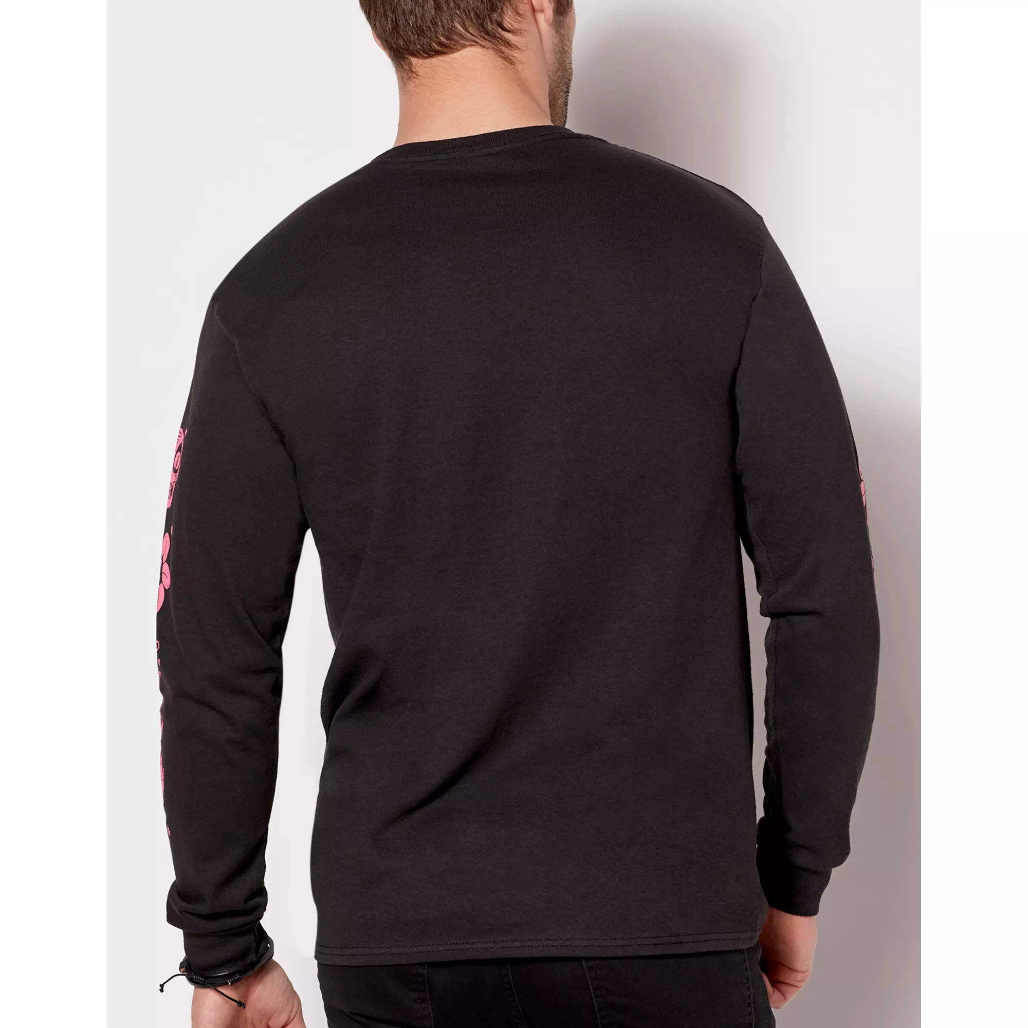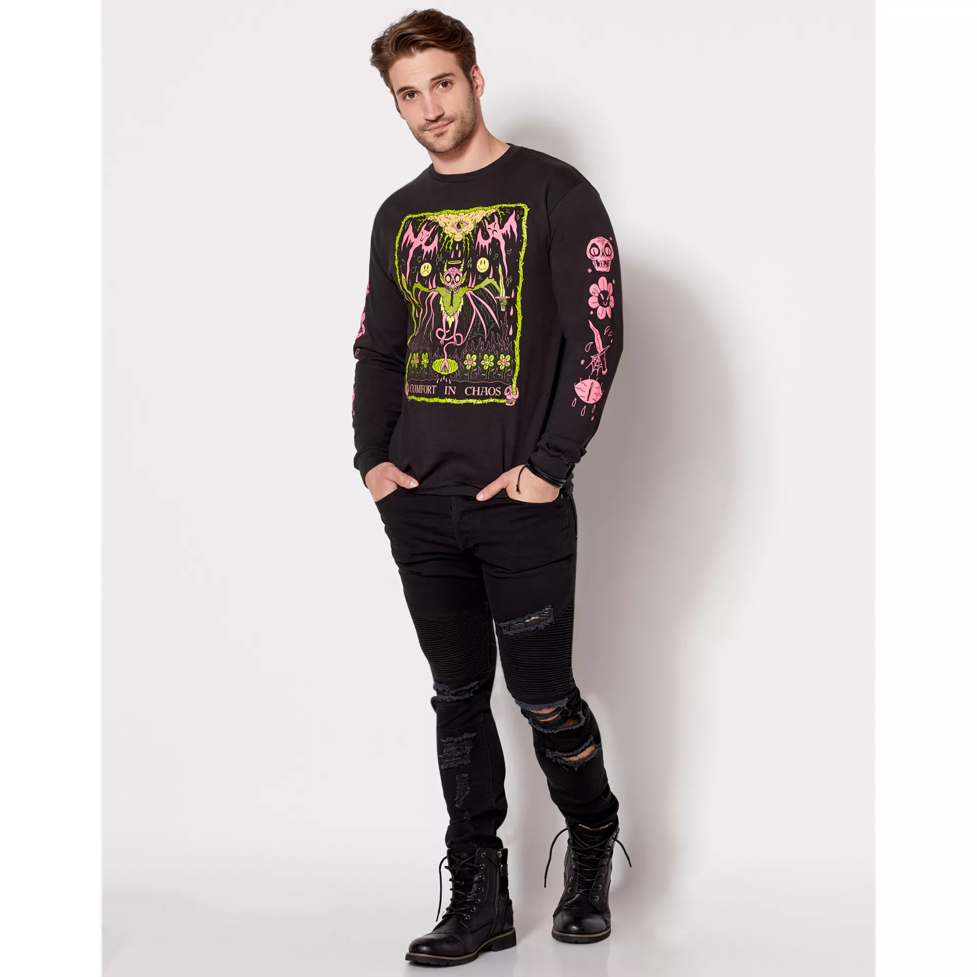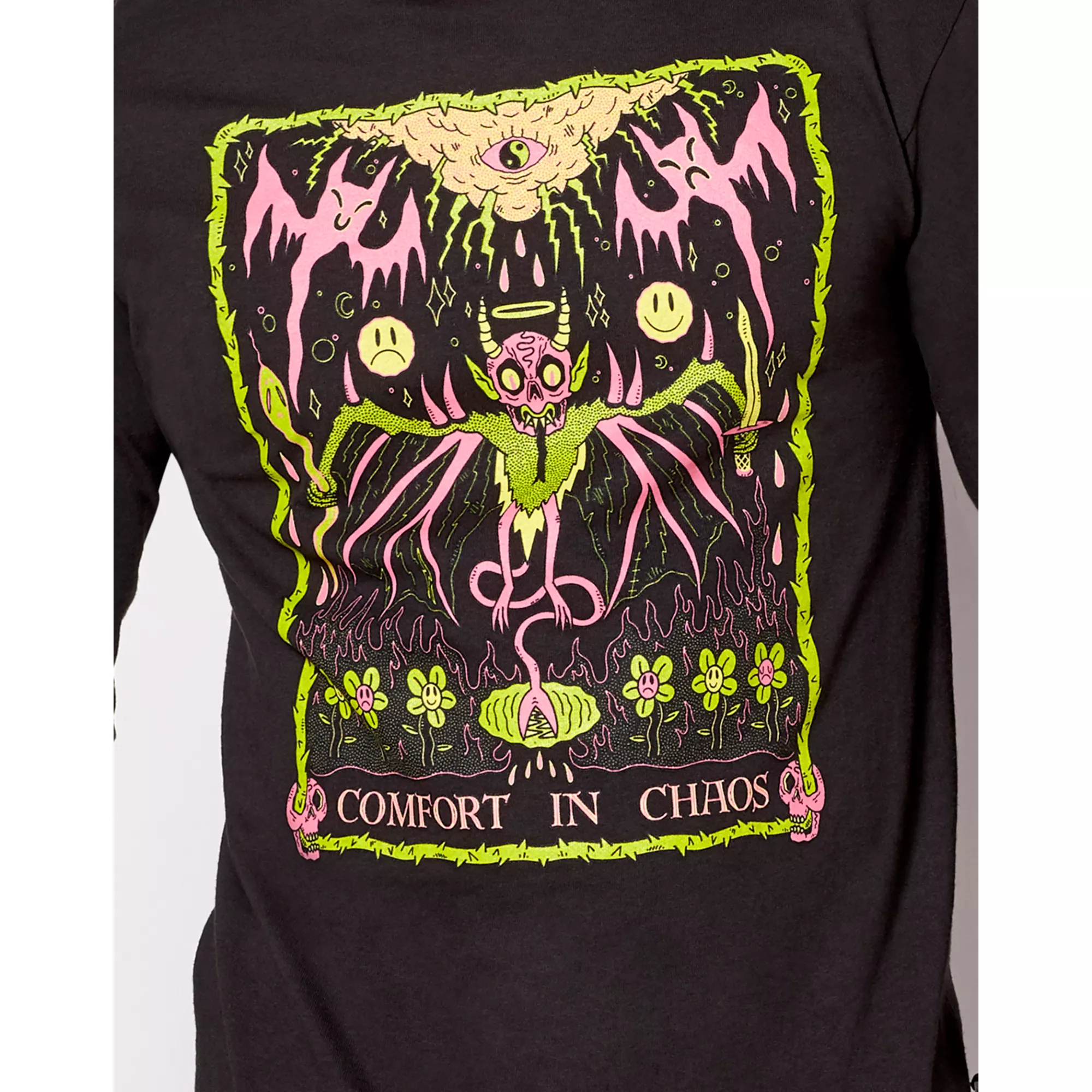 Make a fun fashion statement with this Comfort in Chaos Long Sleeve T Shirt! This black tee has pink and yellow artwork on the front and sleeves that will make everyone want to get a closer look.
