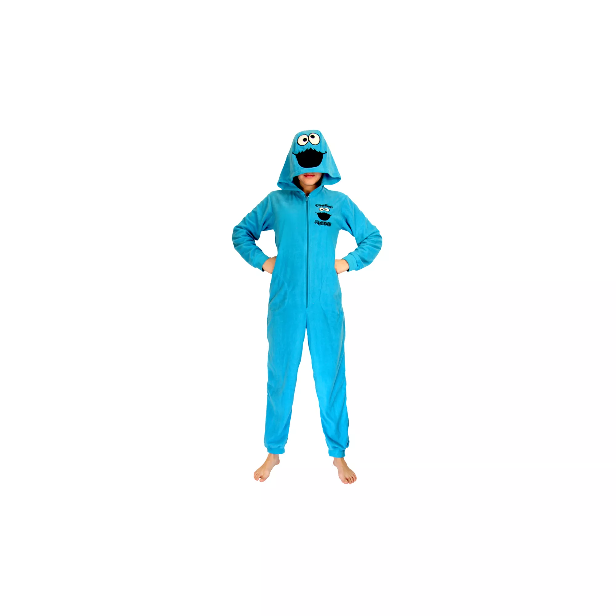 Eat all the cookies before bed when you wear these officially licensed Cookie Monster adult womens hooded pajamas. The blue zipper-front jumpsuit of these womens pajamas features Cookie Monster's face on the hood. Sleep soundly and dream of cookies!