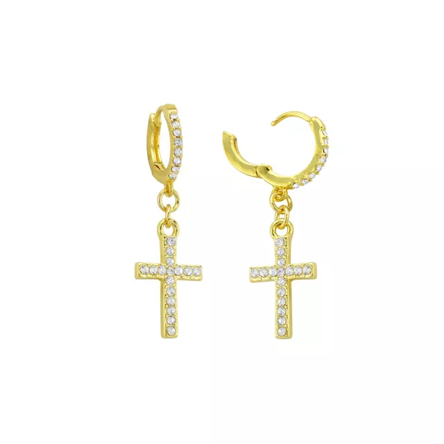 CZ Goldtone Titanium Cross Dangle Huggie Hoop Earrings