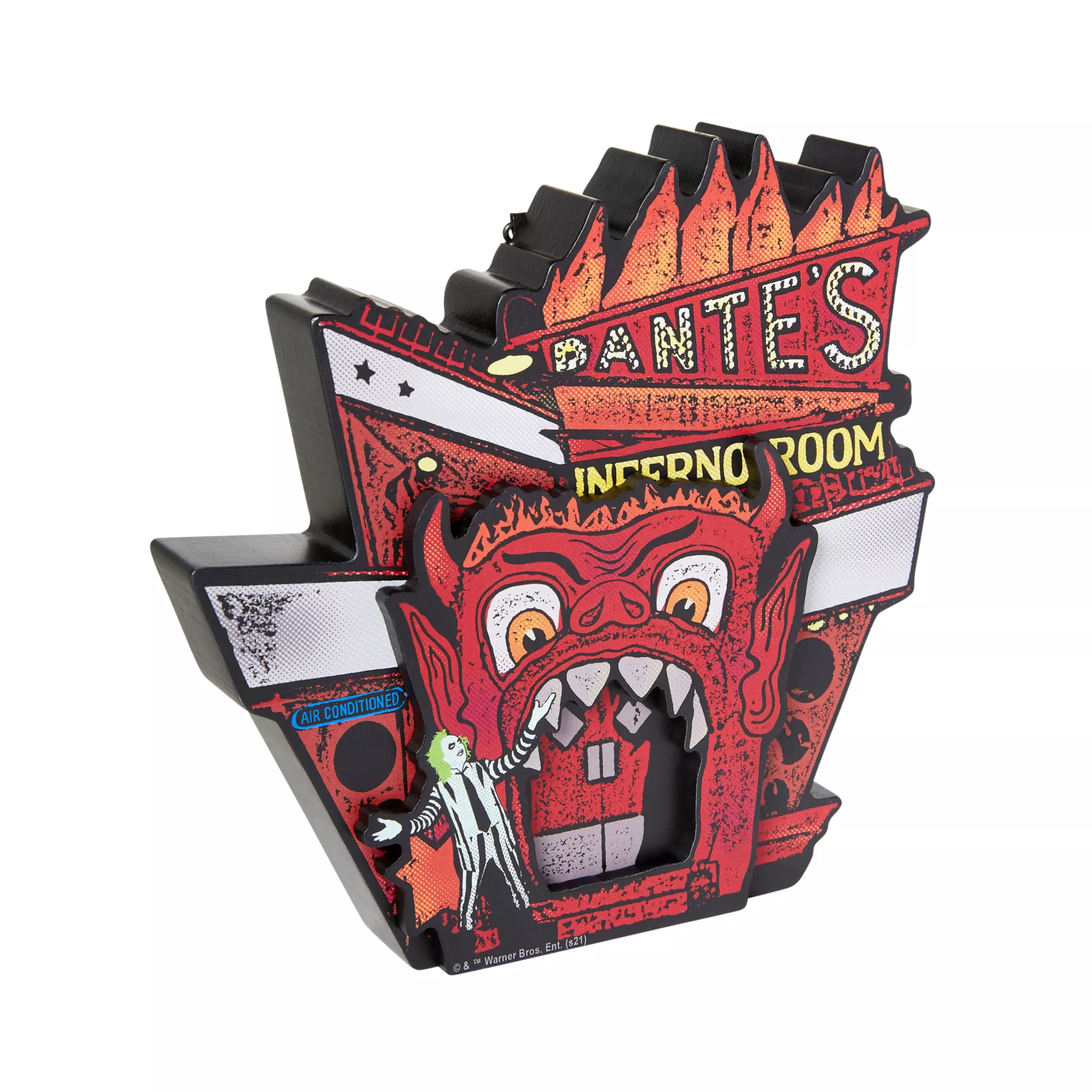 Celebrate one of your favorite movie scenes when you hang this official Beetlejuice Dante's Inferno Sign on your wall! This sign features Beetlejuice with his green hair and black and white striped suit standing at the front of the fictional strip club. With a hook for easy hanging, it's the perfect fun sign for any Beetlejuice fan!
