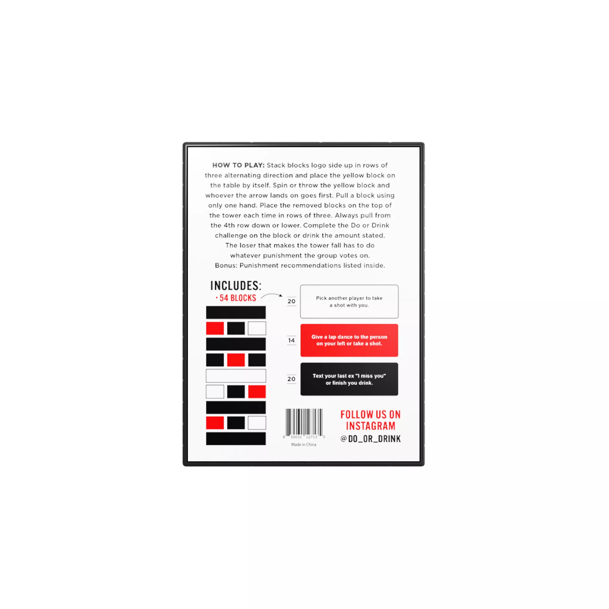 Laugh and have the most fun ever with the Do or Drink Blackout Tower Game! This fun drinking game will have you building blocks and trying not to make the tower fall, and enduring a punishment your friends select if you do. Either way, you'll have a blast!