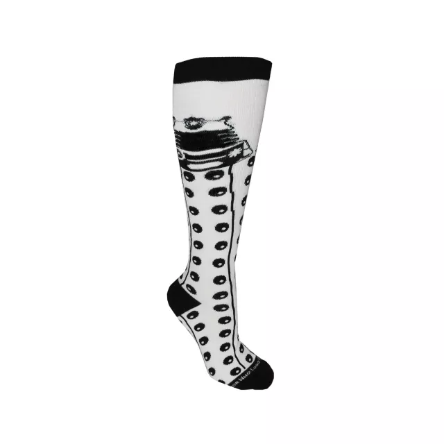 Explore all lands in style in the Officially Licensed Doctor Who Dalek Knee High Socks. These black and white socks feature a Dalek design.