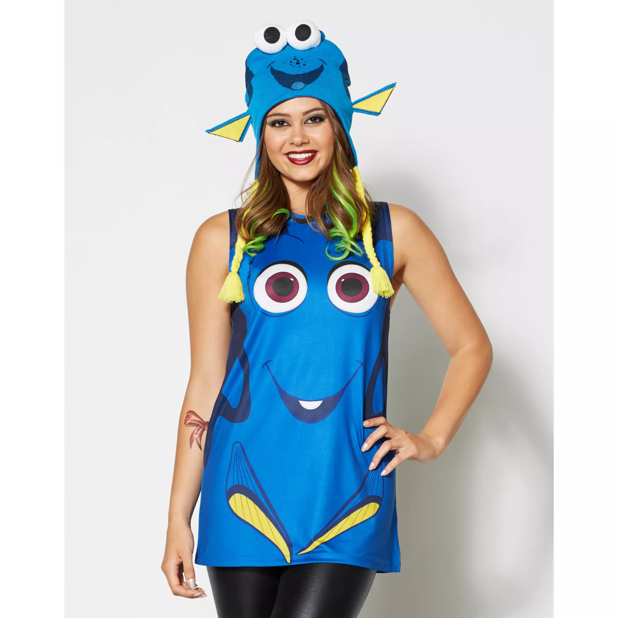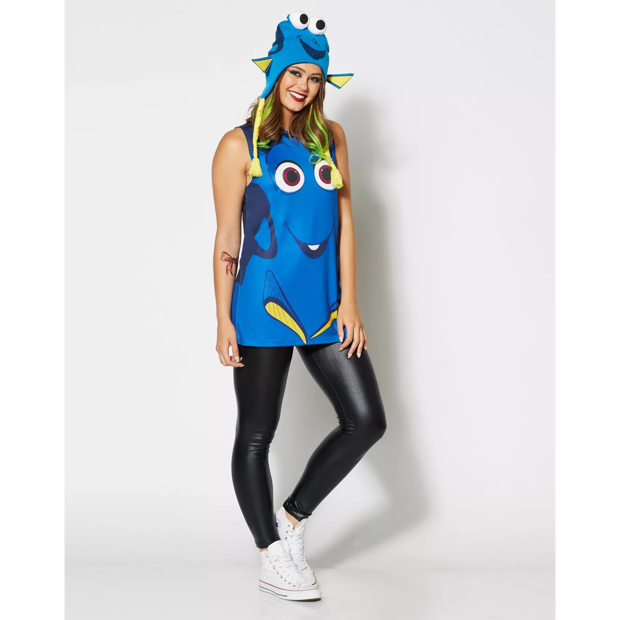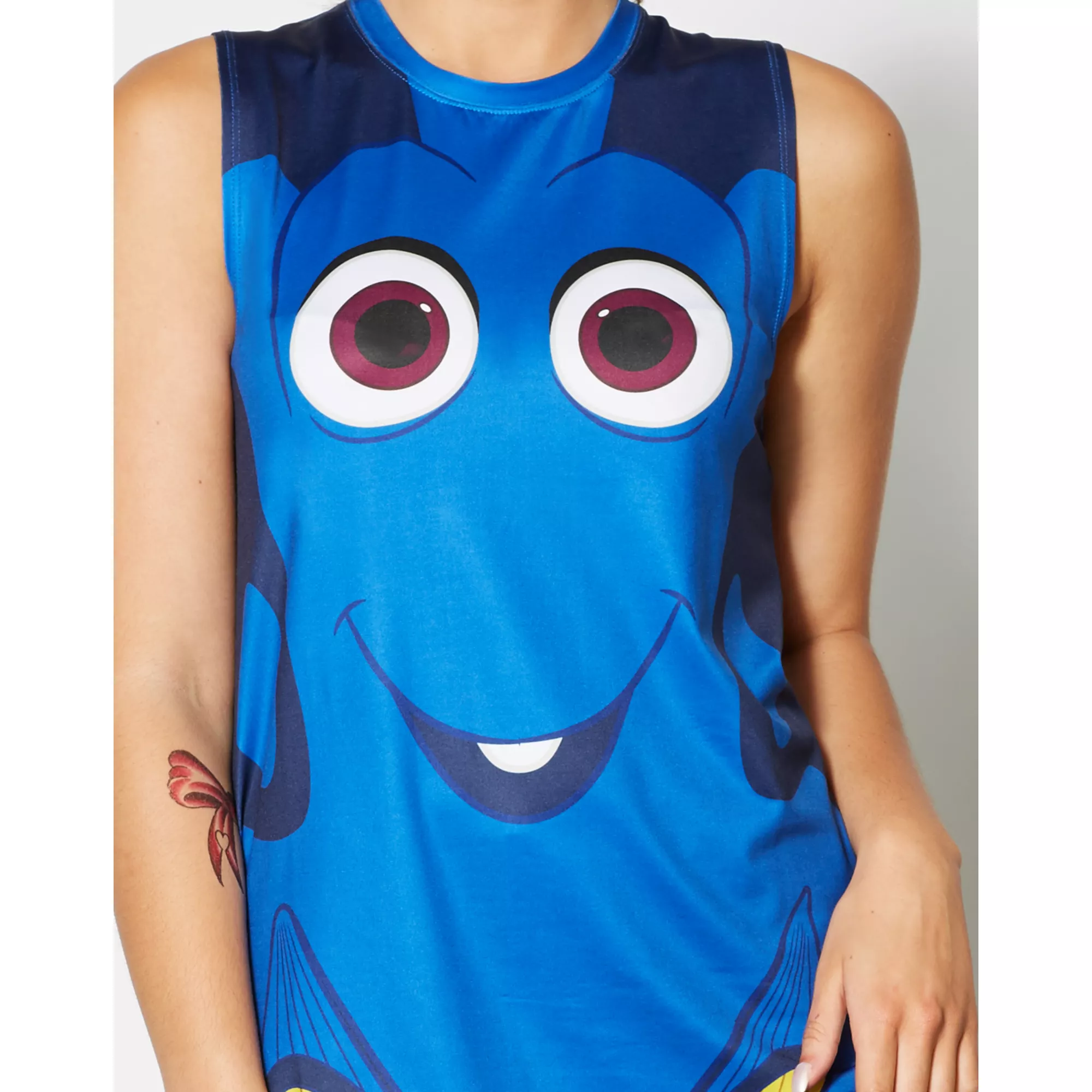 Look as though you're ready to jump into the ocean with this officially licensed Dory tank top! Featuring her happy face and signature blue color with yellow fins, this top is perfect for any Dory-inspired costume!