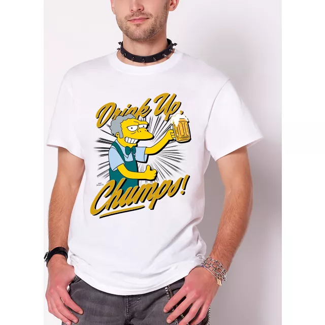 Drink up, chumps! Party, (but not too hard), with The Simpsons crew at Moe's tavern in this officially licensed Drink Up Chumps Moe T Shirt. This iconic tee features Moe holding up a beer and cheering on the bar crowd.
