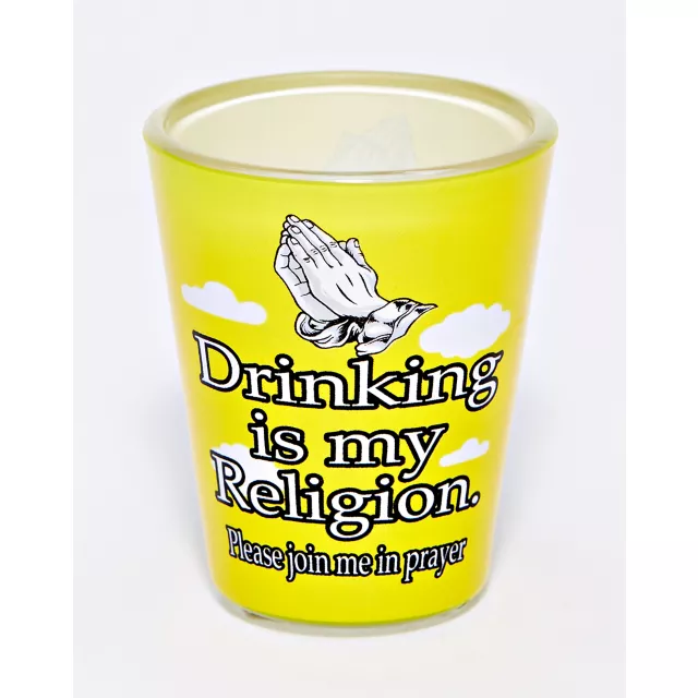 What better way to spend your Sunday than by taking shots? Let everyone know where your faith lies when you have this hilarious shot glass! The yellow wrap decal of this glass reads, "Drink is my Religion. Please join me in prayer," making this shot absolutely perfect for anyone with a sense of humor.