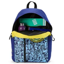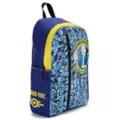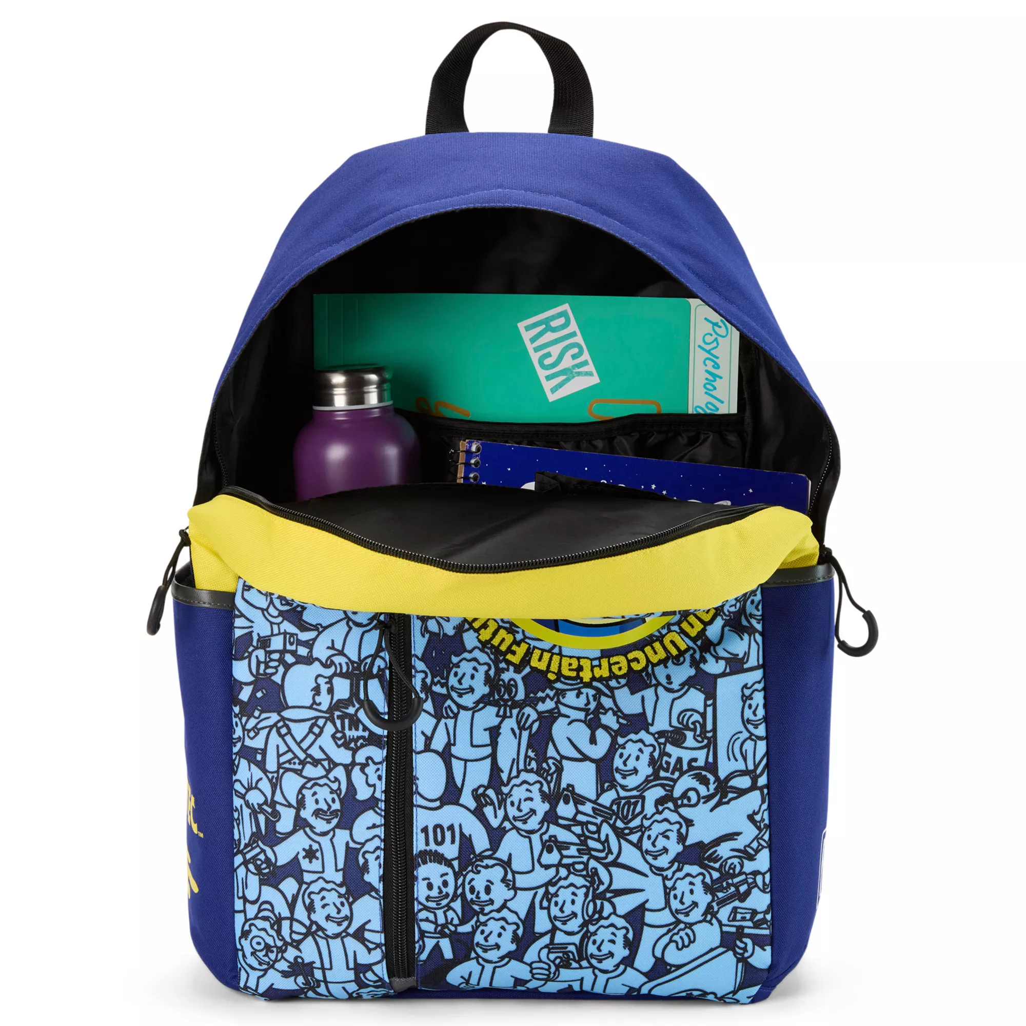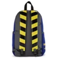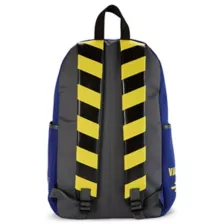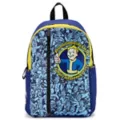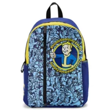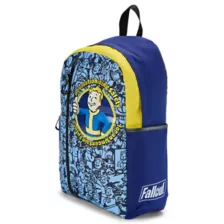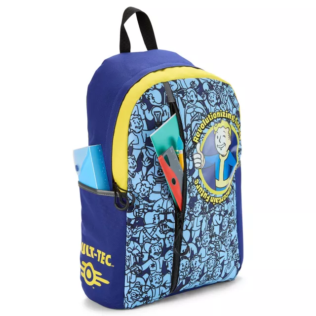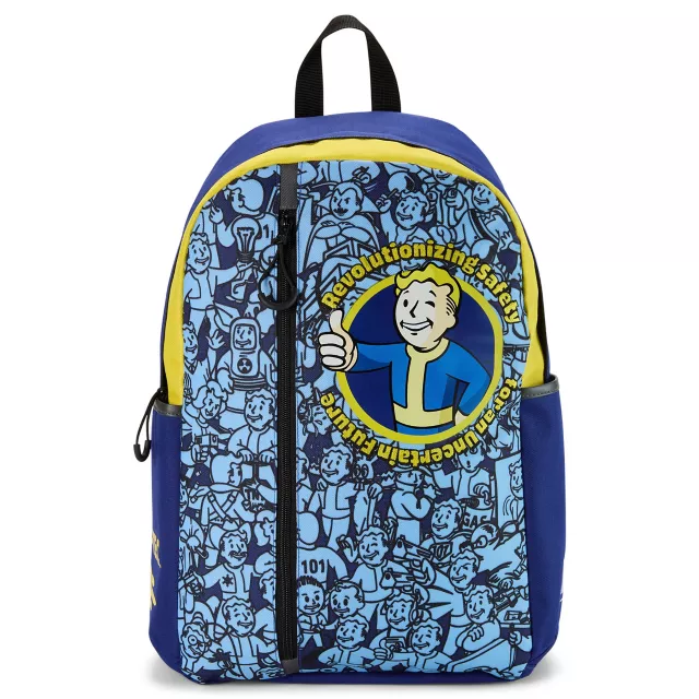Show off your Fallout fandom with this Vault Boy backpack. This backpack features cool blue and yellow hues and a large Vault Boy logo surrounded by the phrase, "Revolutionizing safety for an uncertain future." A front vertical zipper provides a secure place for your valuables, along with several additional external and internal compartments. Carry it all comfortably with adjustable padded straps.