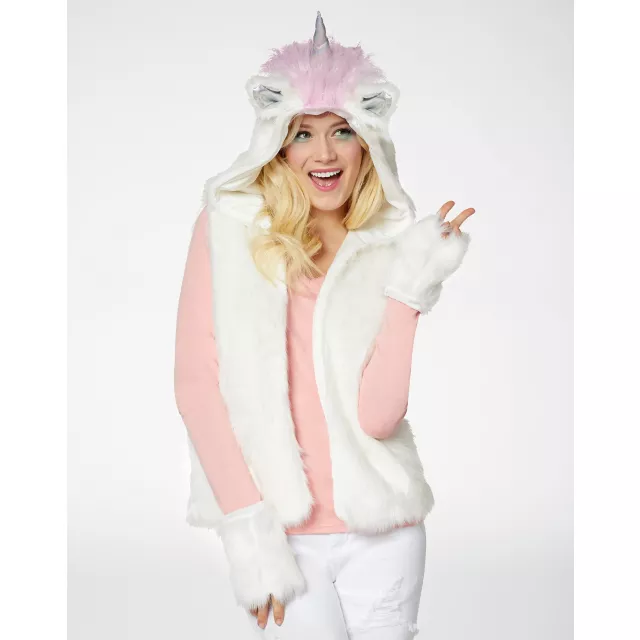 If you're magical and you know it, dress like a unicorn! This faux fur vest is the perfect way to show off your majestic side! The attached hood features an iridescent horn that will have you standing out among the rest!