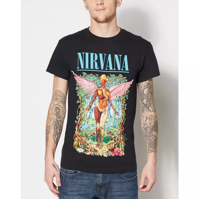 Rock to your favorite band while you rock this awesome Nirvana t shirt! Featuring the winged character from the cover of In Utero surrounded by a flowering forest, this shirt is a must-have for any Nirvana fan.