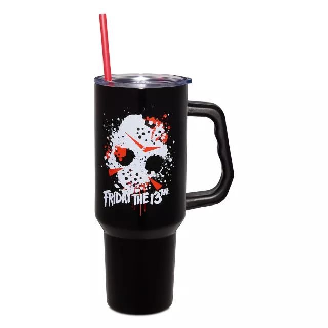 Stay hydrated in style with this officially licensed Friday the 13th Jason Splatter Mask Travel Tumbler with Straw! Complete with a scary-chic Jason Voorhees-inspired decal and a whopping 40-ounce capacity, this cup is perfect for enjoying your favorite beverages on the go.