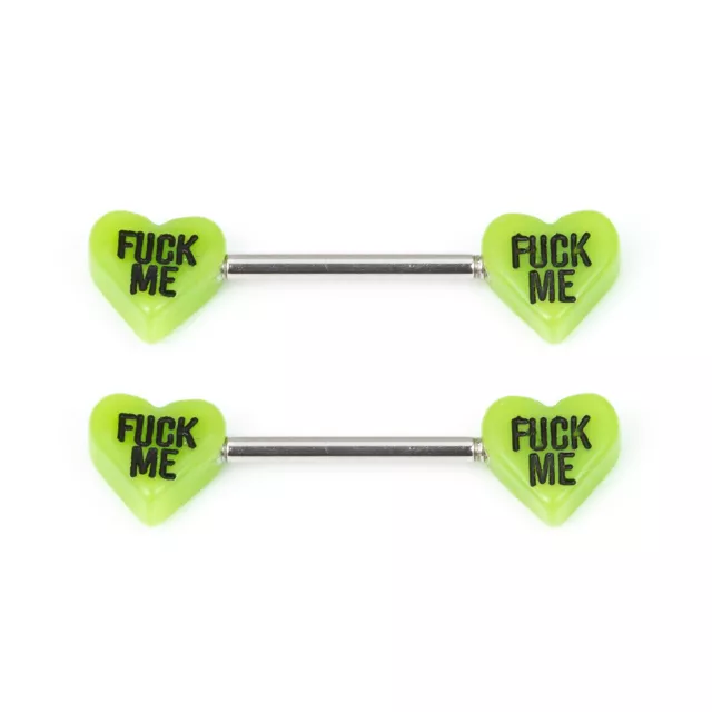 Fuck Me Green Heart Nipple Barbells - 14 Gauge