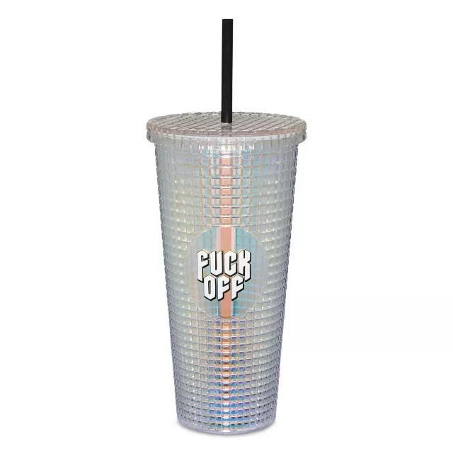 Stay hydrated and keep unwanted conversations at bay when you get this hilarious water bottle, featuring a textured iridescent design that includes the words "Fuck Off" on the side. This sassy and stylish cup includes a lid and straw, making it easy to bring your favorite beverage on all your daily adventures.