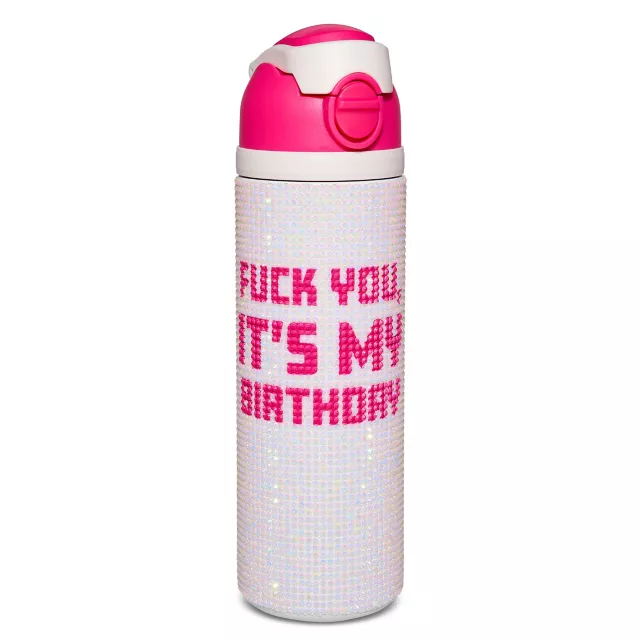 Make each sip feel like a birthday wish when you use this exclusive Fuck You It's My Birthday Rhinestone Water Bottle! Dripped out in dazzling pink rhinestones and fitted with a built-in lid and straw, this bedazzled beauty will have you hydrated to the max all birthday long.