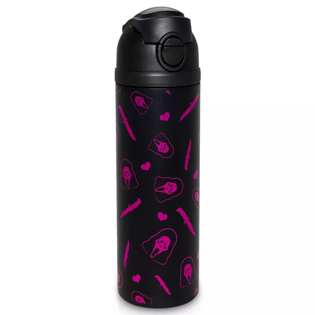 See hearts with each sip when you use this officially licensed, exclusive Ghost Face Heart Print Water Bottle! Decked out in black and hot pink contrast decals and fitted with a built-in lid and straw, this iconic piece will have you fall in love with horror-clad hydration.