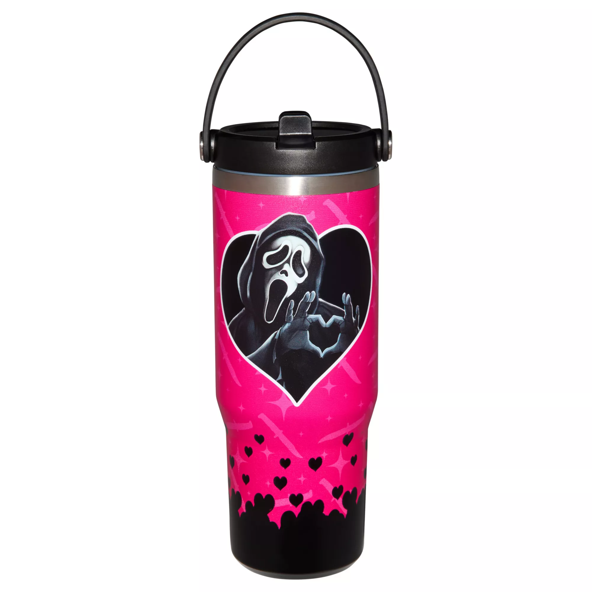 Watching horror movies can certainly work up a thirst. Rep your favorite slasher villain and stay hydrated on the go with this officially licensed Ghost Face Heart Travel Tumbler. 30 ounces of adorable evil, this water bottle features an attached handle and embraces the lighthearted side the legendary killer.
