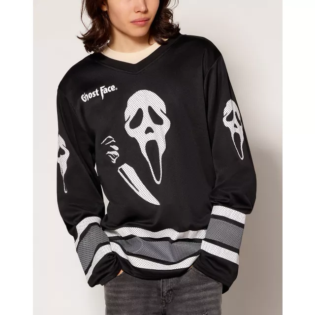 Make your outfit a total scream with this Ghost Face ® hockey jersey! Featuring Ghost Face ® holding his knife on the front and "Ghost Face 96" on the back, this look is the perfect killer style that's sure to be popular.