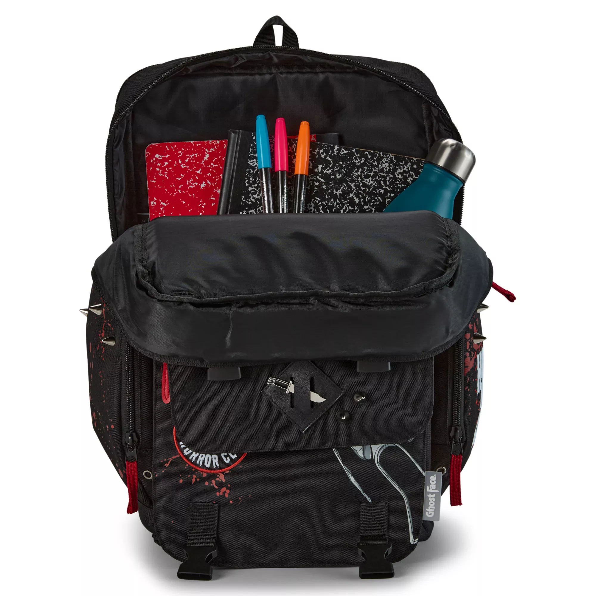 New semester scaries! Carry all of your killer essentials with this officially licensed Ghost Face Horror Club Built-Up Backpack. This spacious backpack includes two side pockets, a large front pocket, and adjustable straps.