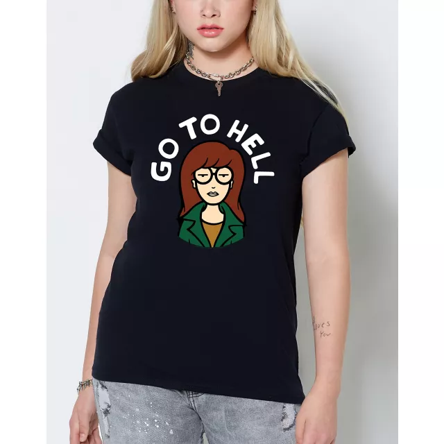 Everyone will know you're not in the mood for any B.S when you rock this hilarious Go to Hell T Shirt. This officially licensed tee features a picture of Daria on the front and is a perfect way to show your love for the show and your feisty attitude.