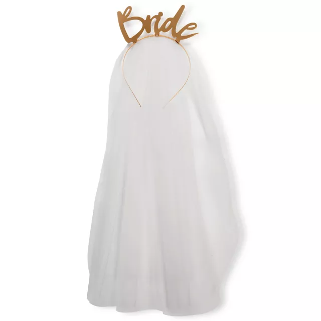 You're the bride! Let everyone know your big day is coming up with this exclusive Gold Bride Headband with Veil.