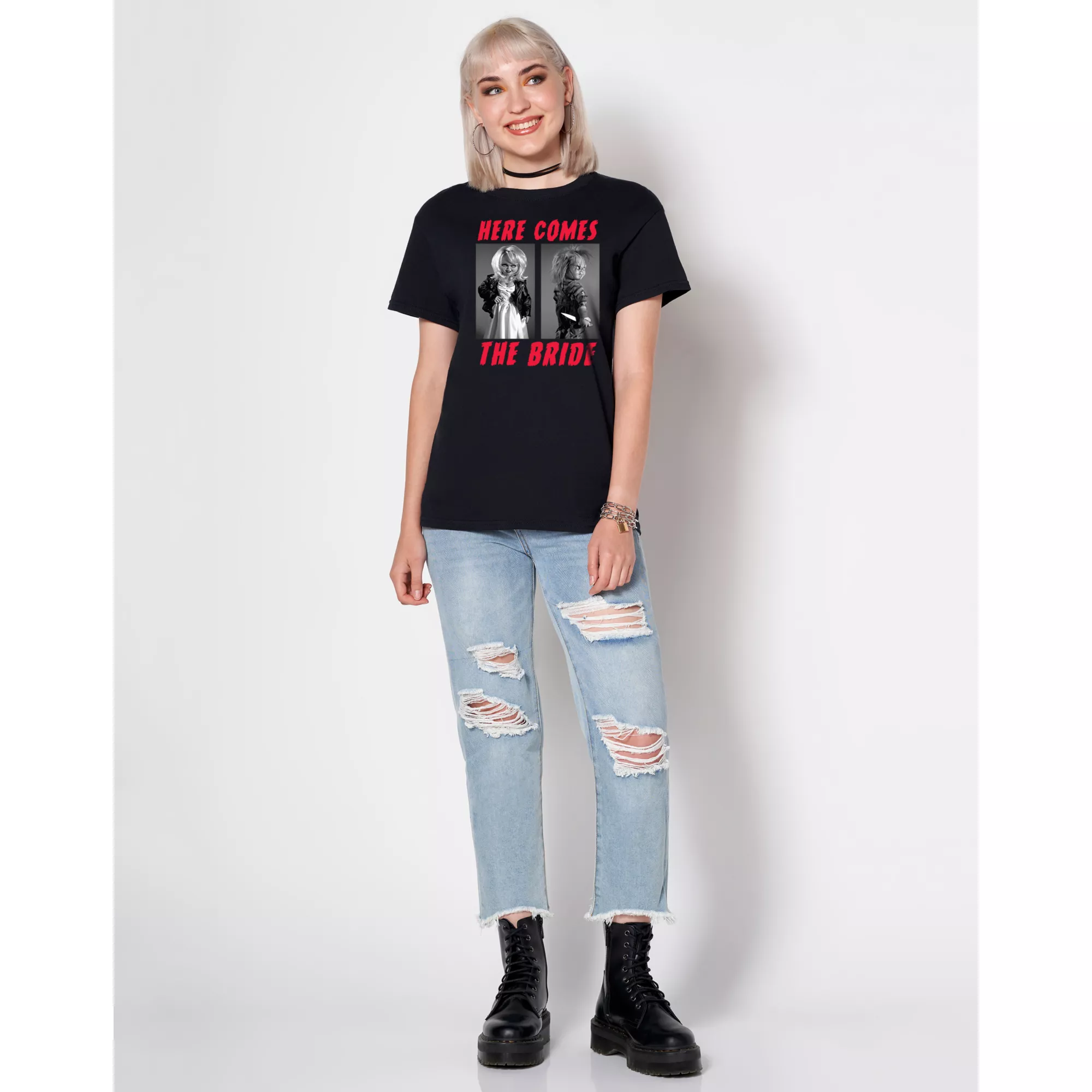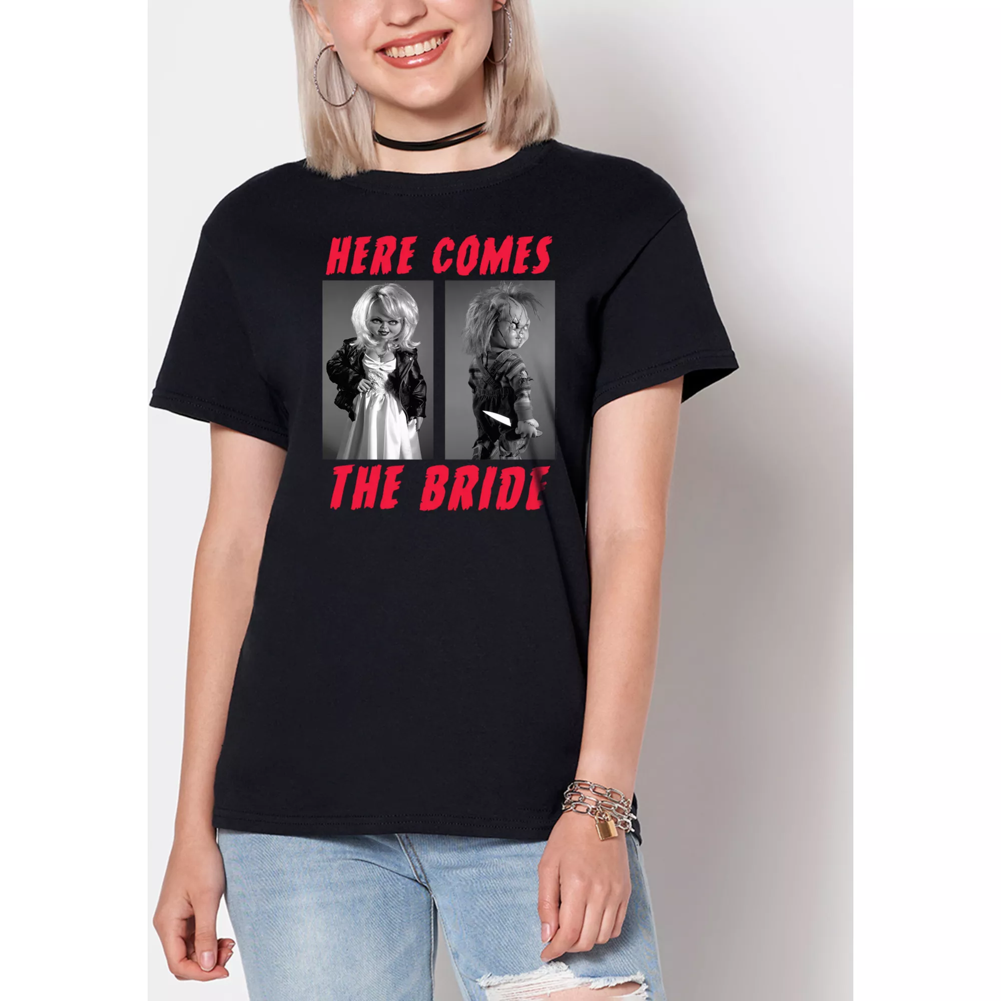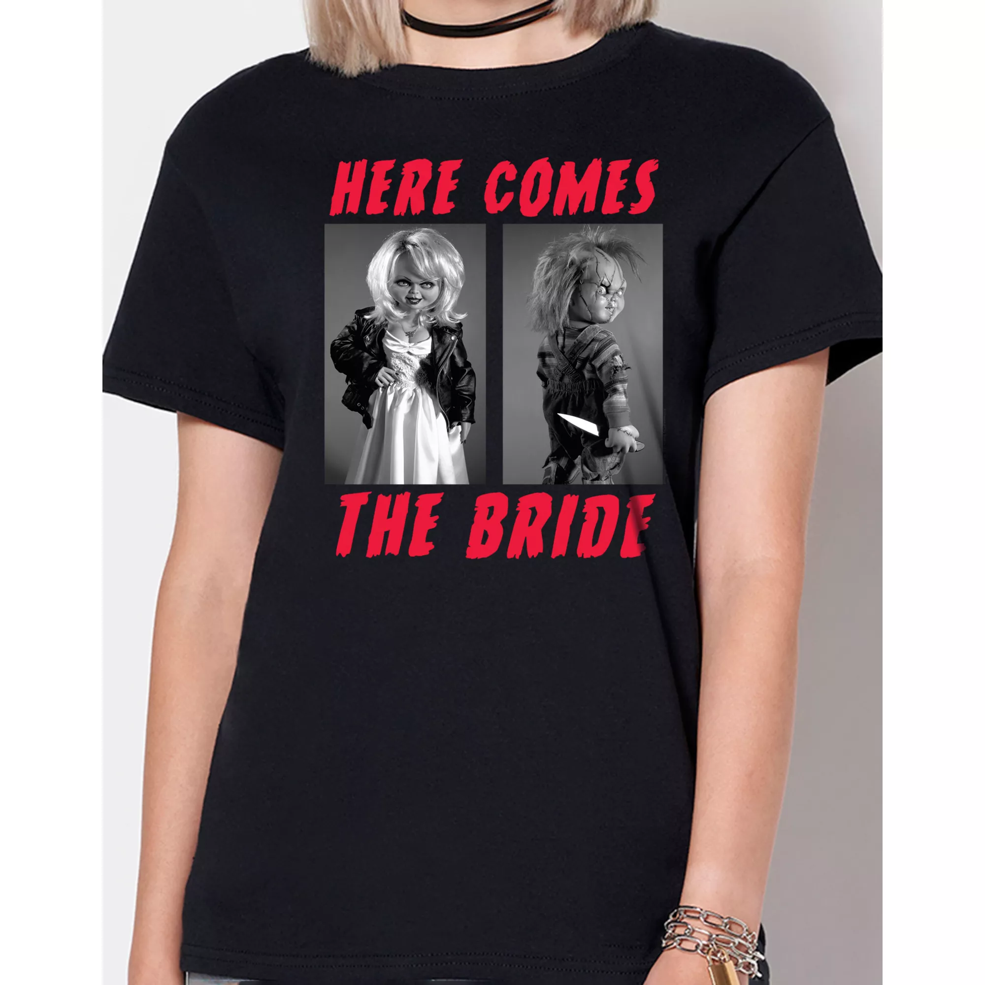 Take on your day with your favorite terrible twosome by your side with this terrifying tee! Featuring Chucky and Tiffany, this tee is a great choice for any horror fan looking to up their slasher style.