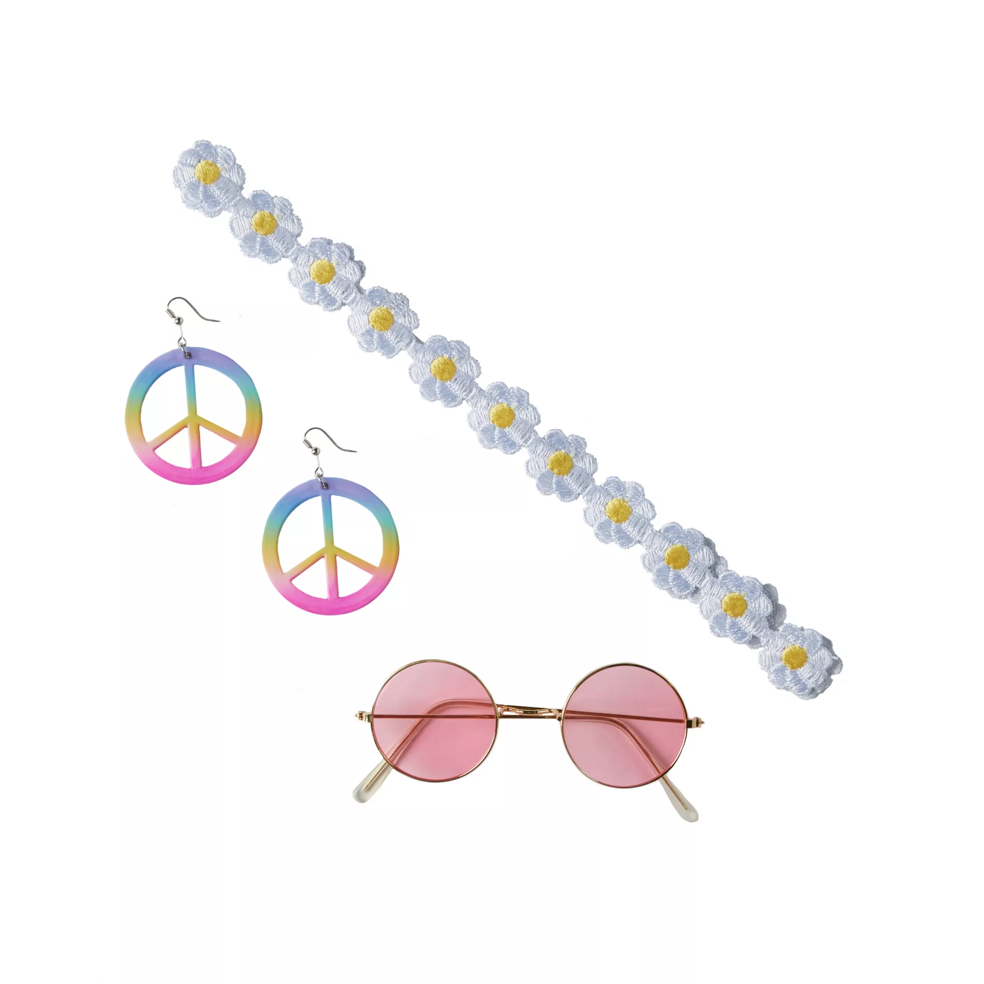 Peace out of your old attire and try something new on Halloween when you use this Hippie Kit. Rock star sunglasses, daisy headband and tie dye peace sign earrings go great with a tie dye shirt and a pair of bell bottoms.