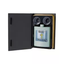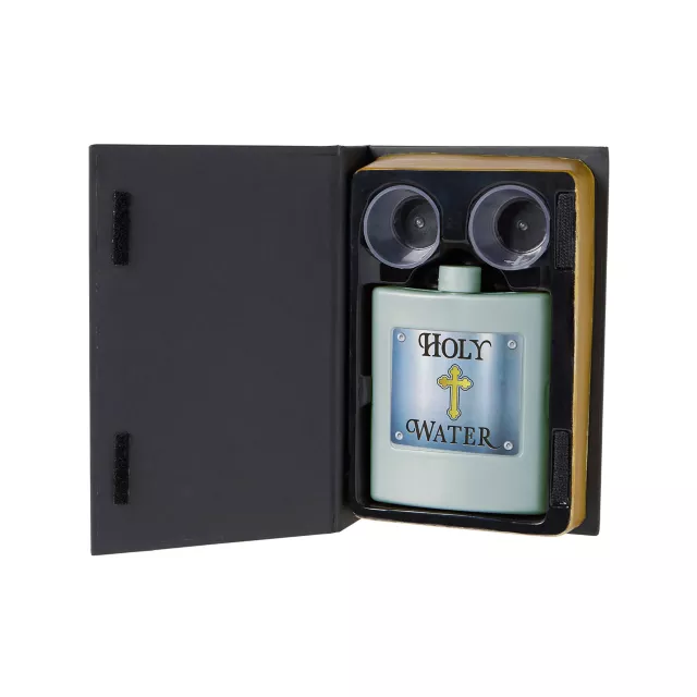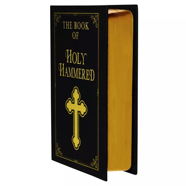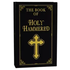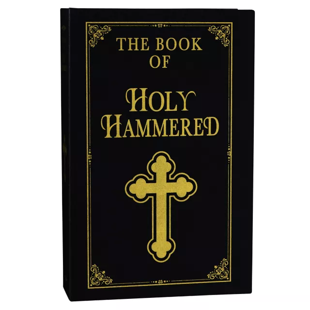 Share the faith when you offer to spread the good word with this bible-style Holy Hammered drinking book. The book opens to reveal a "secret" cut-out equipped with a monogrammed flask and two shot