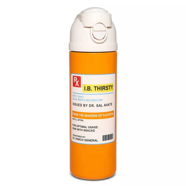 Get your fix of hydratiion when you use this exclusive I.B. Thirsty Prescription Water Bottle! Dripped out in an RX-inspired design and fitted with a built-in lid and straw, this statement-making bottle is just what the doctor ordered.