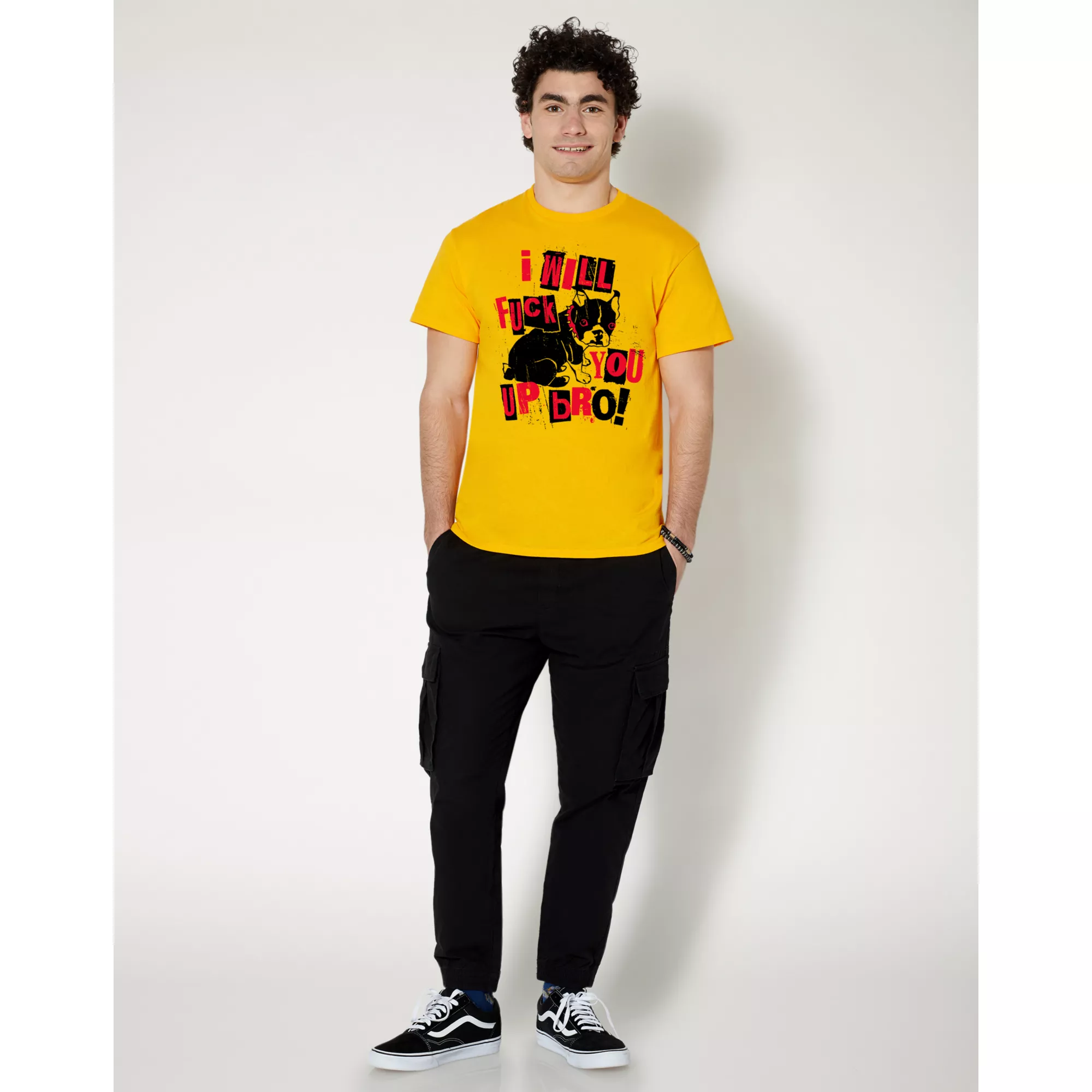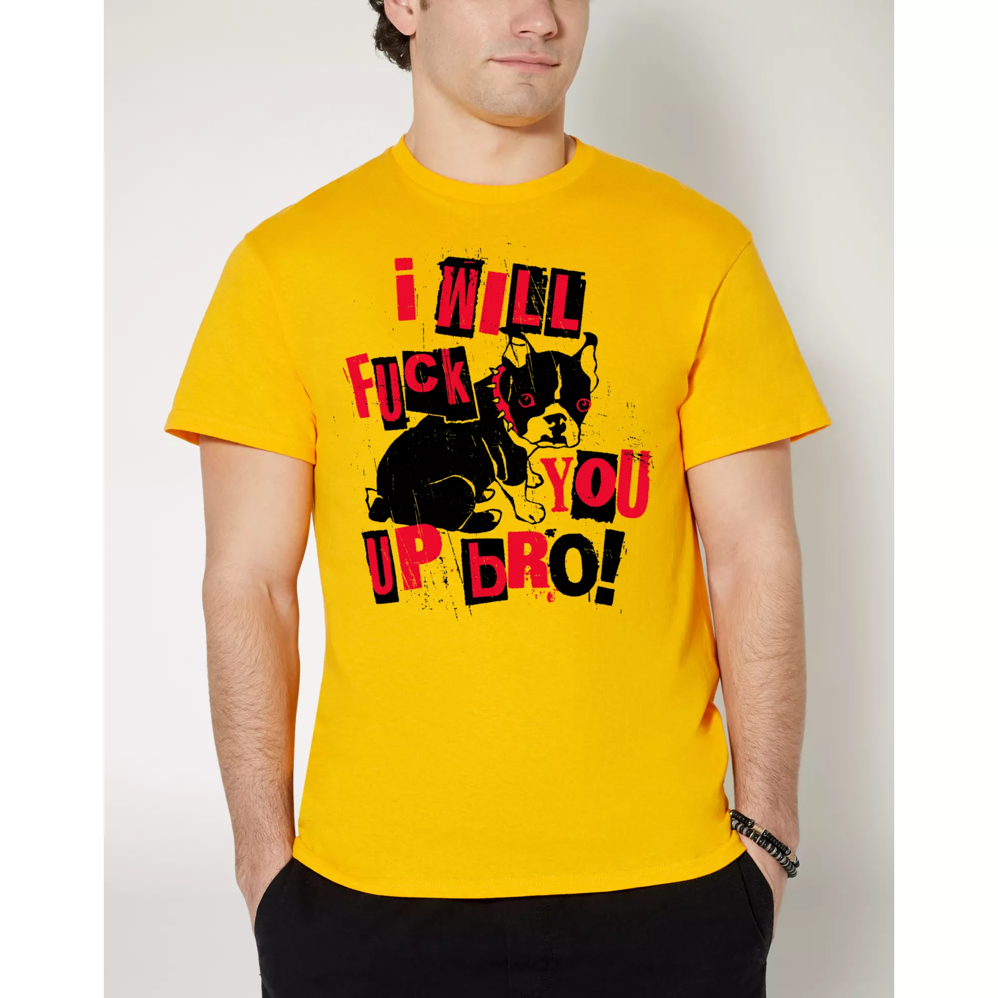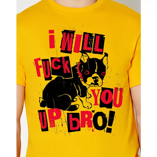 Make a statement with your wardrobe when you slip into this I Will Fuck You Up Bro T Shirt! This hilarious tee, which features bright, colorful detailing and is centered with a grumpy pooch, will add the perfect touch of silly style to your look.