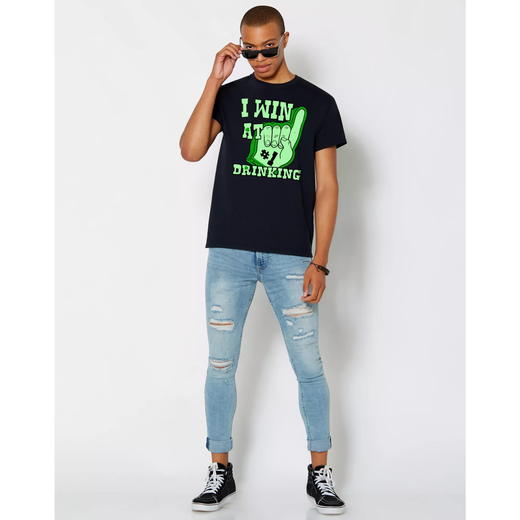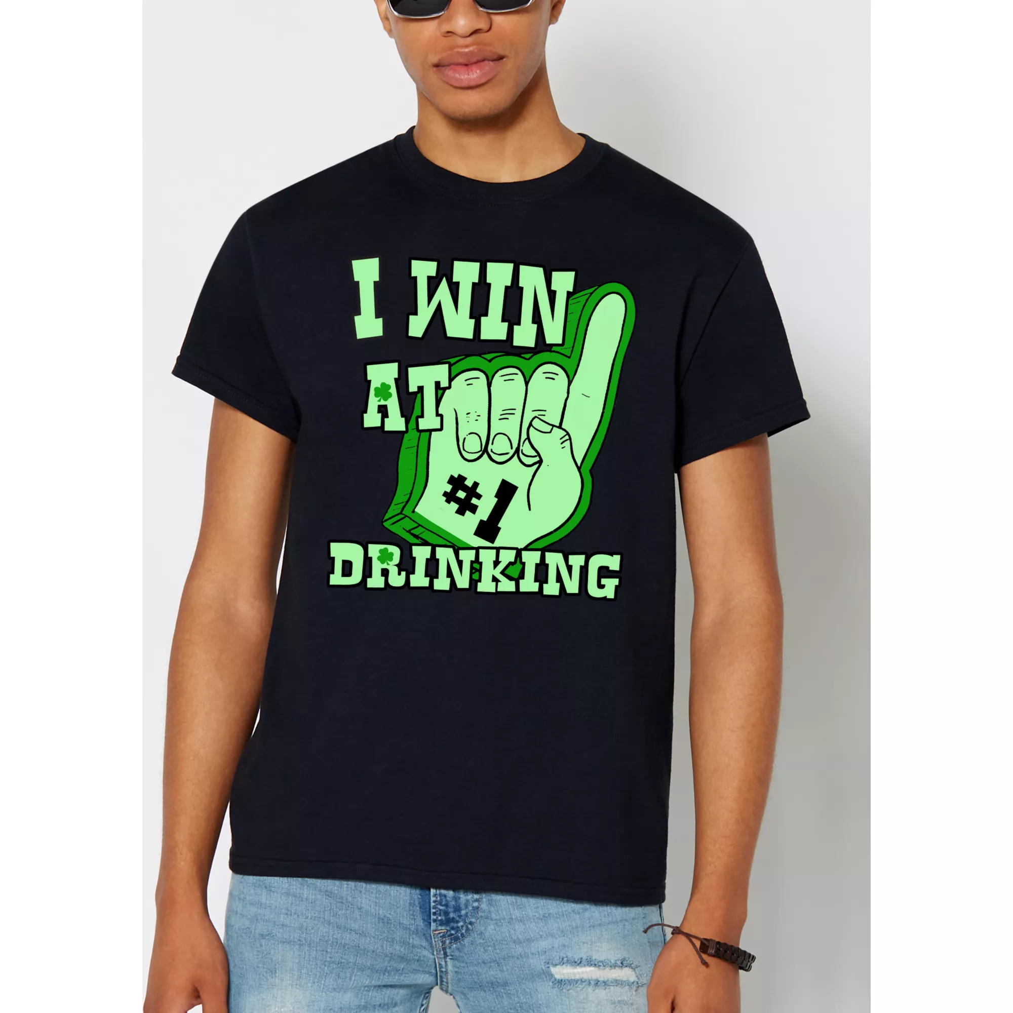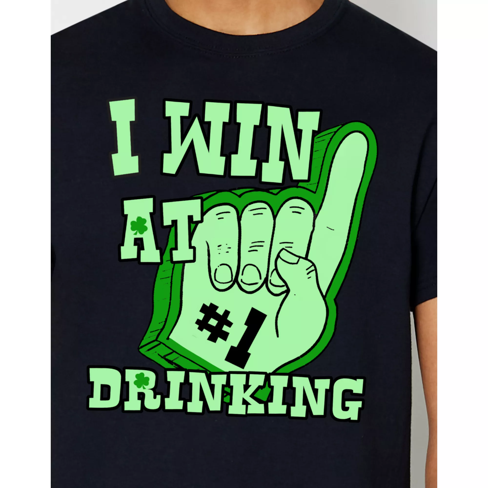 Drinking champion? Let everyone at the bar know you rule with this I Win At Drinking t shirt! This funny graphic tee is the perfect gear for St. Patrick's Day or any time you want to get loaded.