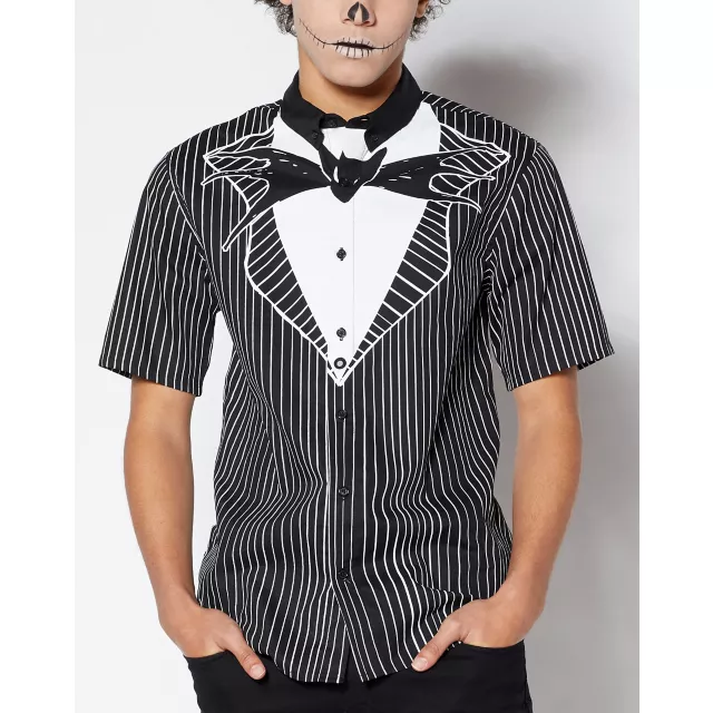 From Halloween to the Holidays, celebrate like your favorite pumpkin king in this officially licensed shirt. Black and white pinstripes and collar details will have you looking just like Jack Skellington himself. You wont know whether to say Happy Halloween or Merry Christmas!