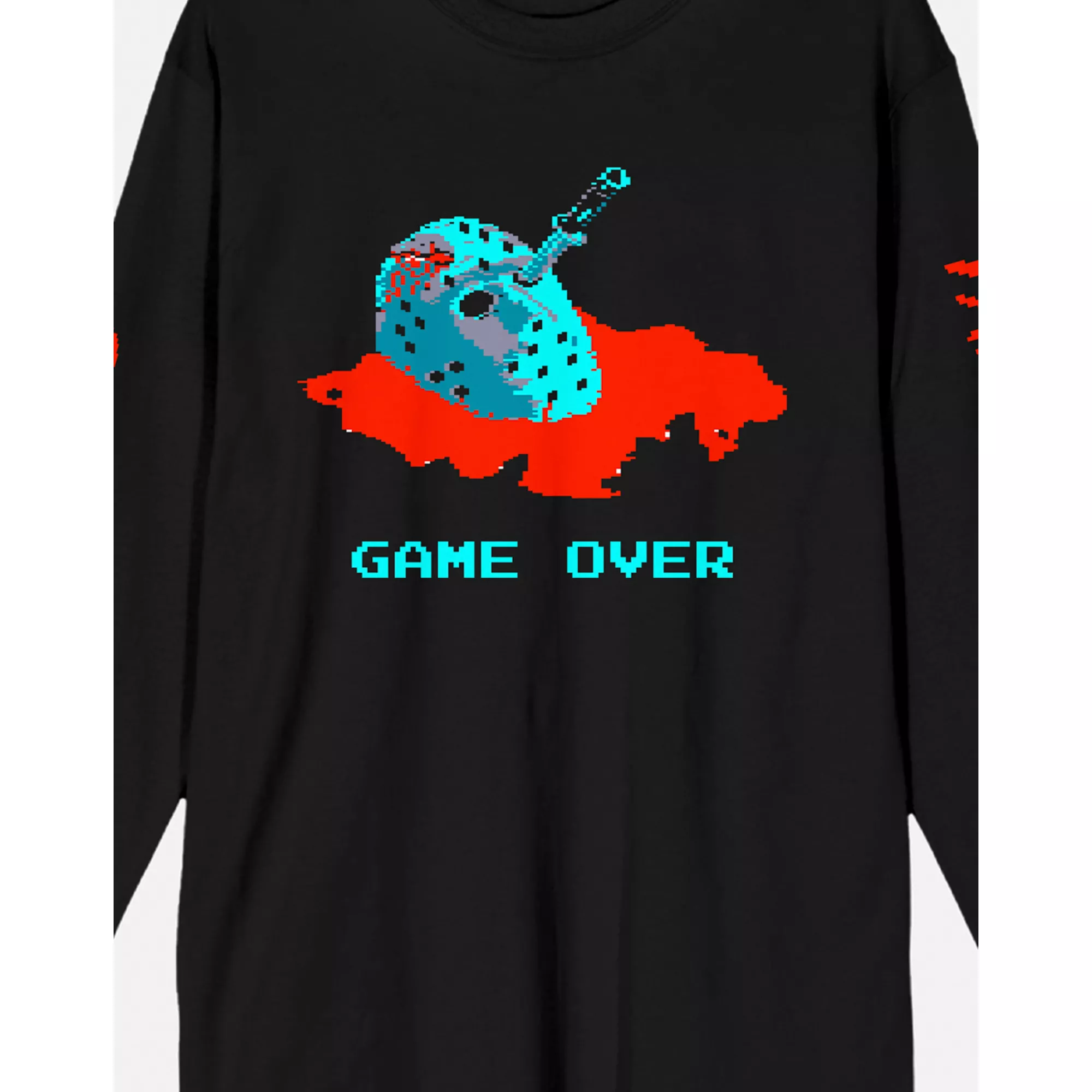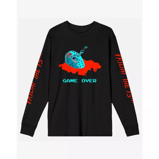 Add something horrifying to your wardrobe with this officially licensed Jason Voorhees long-sleeved t shirt. This black graphic tee features a bloody hockey mask along with the words "GAME OVER."