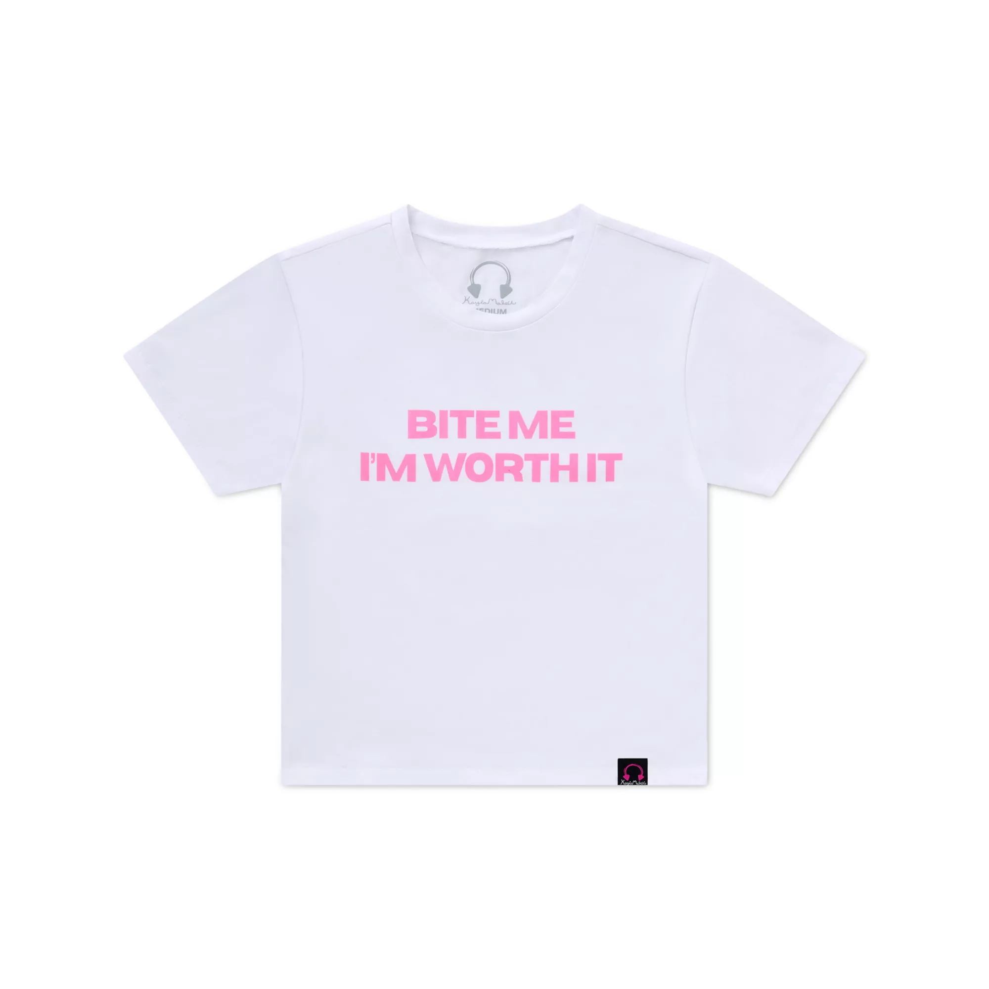 Ditch the milk and cookies - you ARE the holiday treat. Ring in the holidays in style with this officially licensed Kayla Malecc Bite Me I'm Worth It Baby T Shirt! Decked out in bold, pink lettering and even bolder attitude, this tee will have everyone wanting a mouthful.