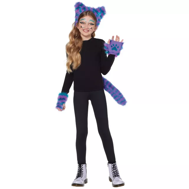 Meow! Add some colorful fun to Halloween night with this Kids Alice Striped Cat Costume Kit! This bright blue and purple kit, which includes a headband, a tail, and gloves, is sure to keep you warm and cozy all night long.