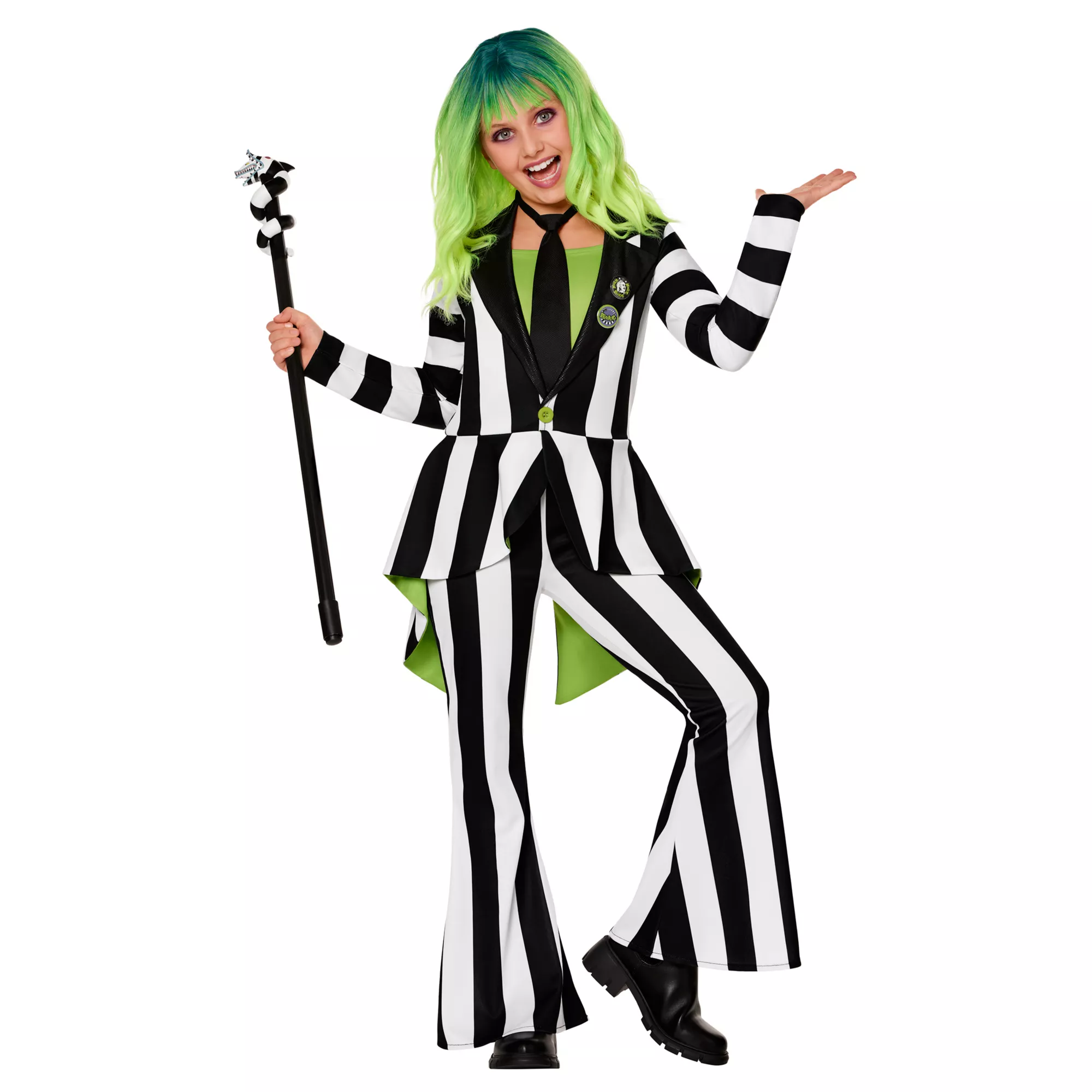 Hoping to channel your inner bio-exorcist? Everybody will know how much you love Beetlejuice when you show up to your Halloween celebration in this officially licensed costume. This high-quality outfit features a jumpsuit that's designed to look exactly like Beetlejuice's iconic suit. Pair it with the included tie and lapel pins and you'll look straight out of your favorite movie!