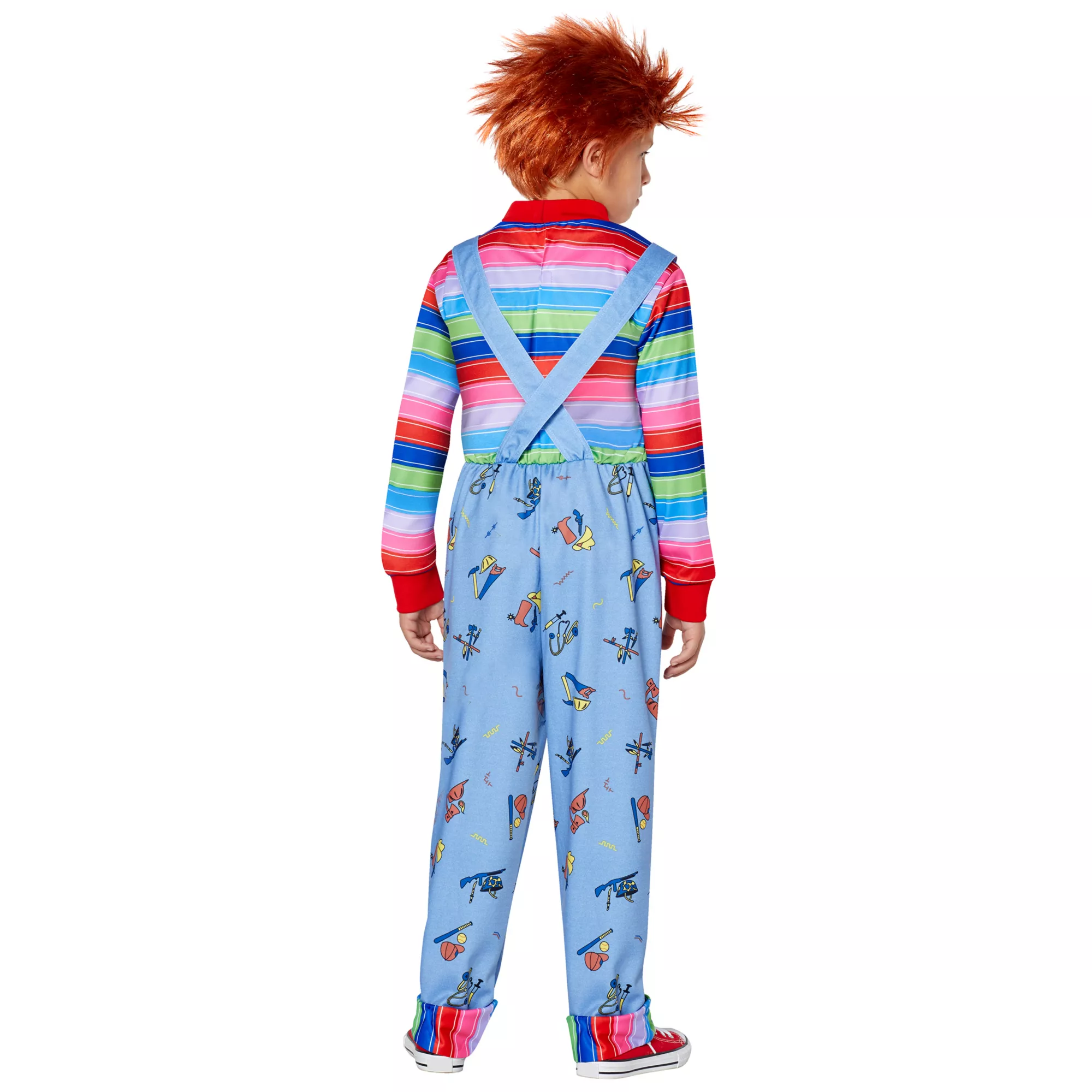 Wanna play?! This officially licensed Chucky costume is perfect for every little boy that wants to cause some trouble on Halloween night. Slip into the overall costume and attached shirt and add the orange wig for a complete look!
