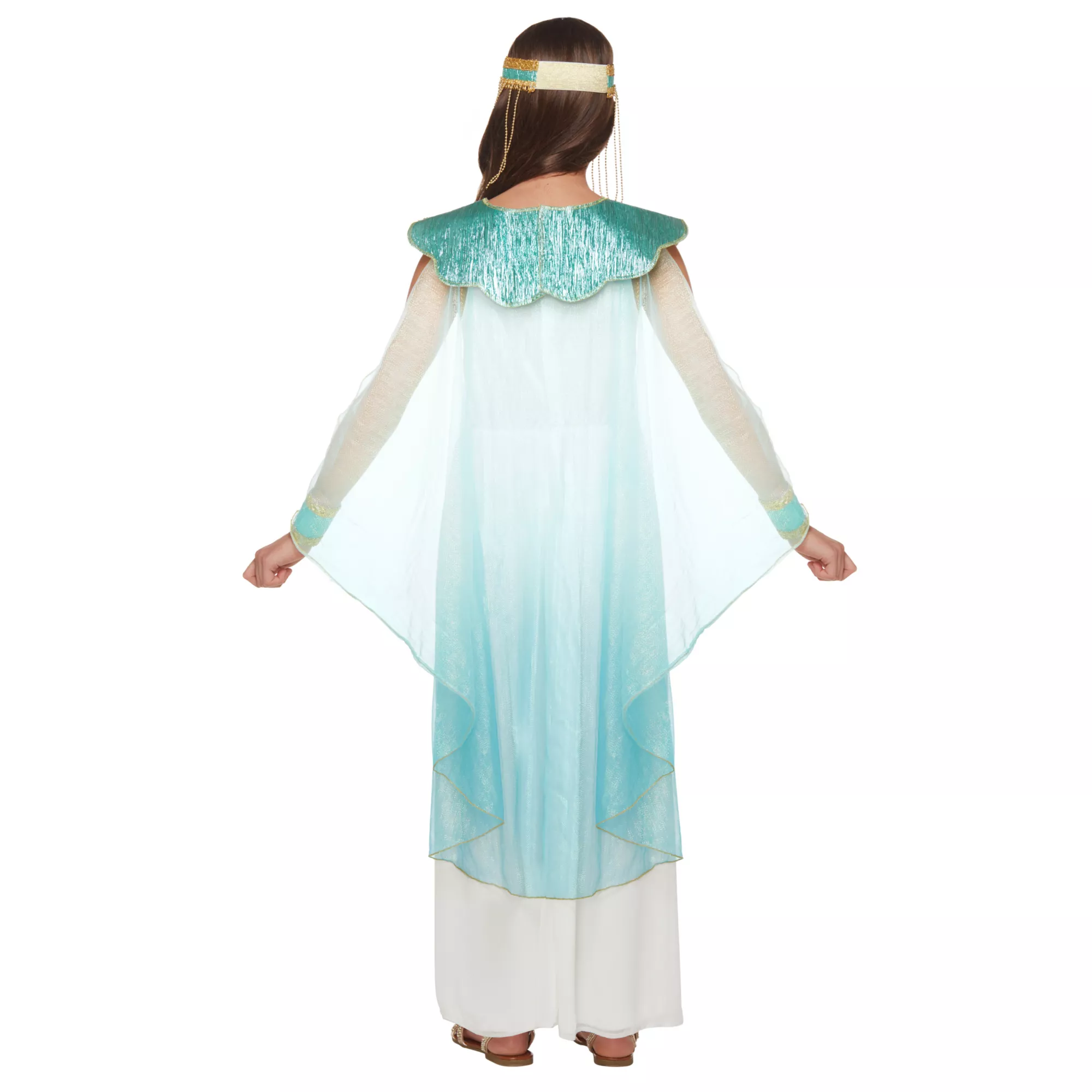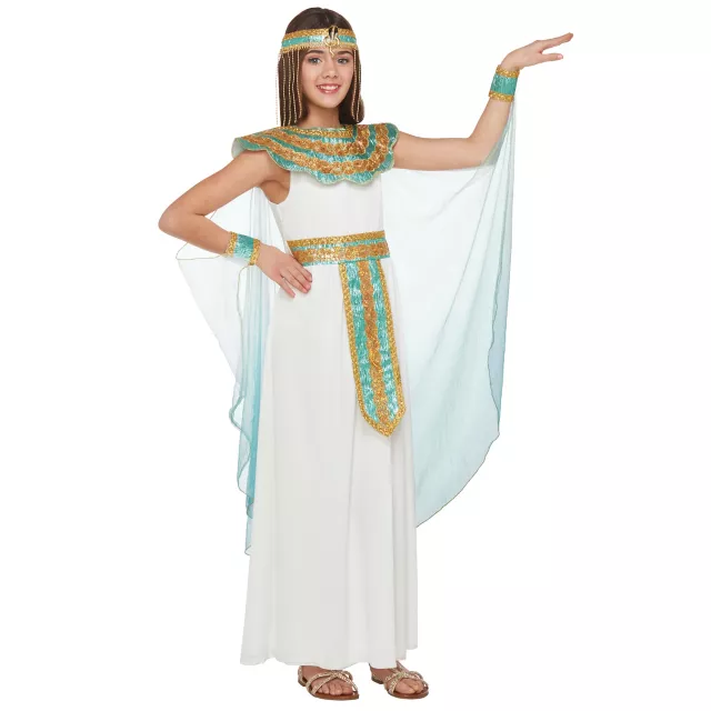 Have your child become one of the most famous rulers of Egypt in style when they wear this lovely Cleopatra costume! The white dress is accented in light blue and glimmering goldtone details, and includes everything you need to complete your child's ultimate pharaoh-like look, including the gilded cobra embellishment that's strategically placed on the headband.