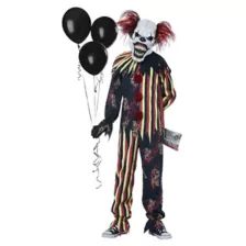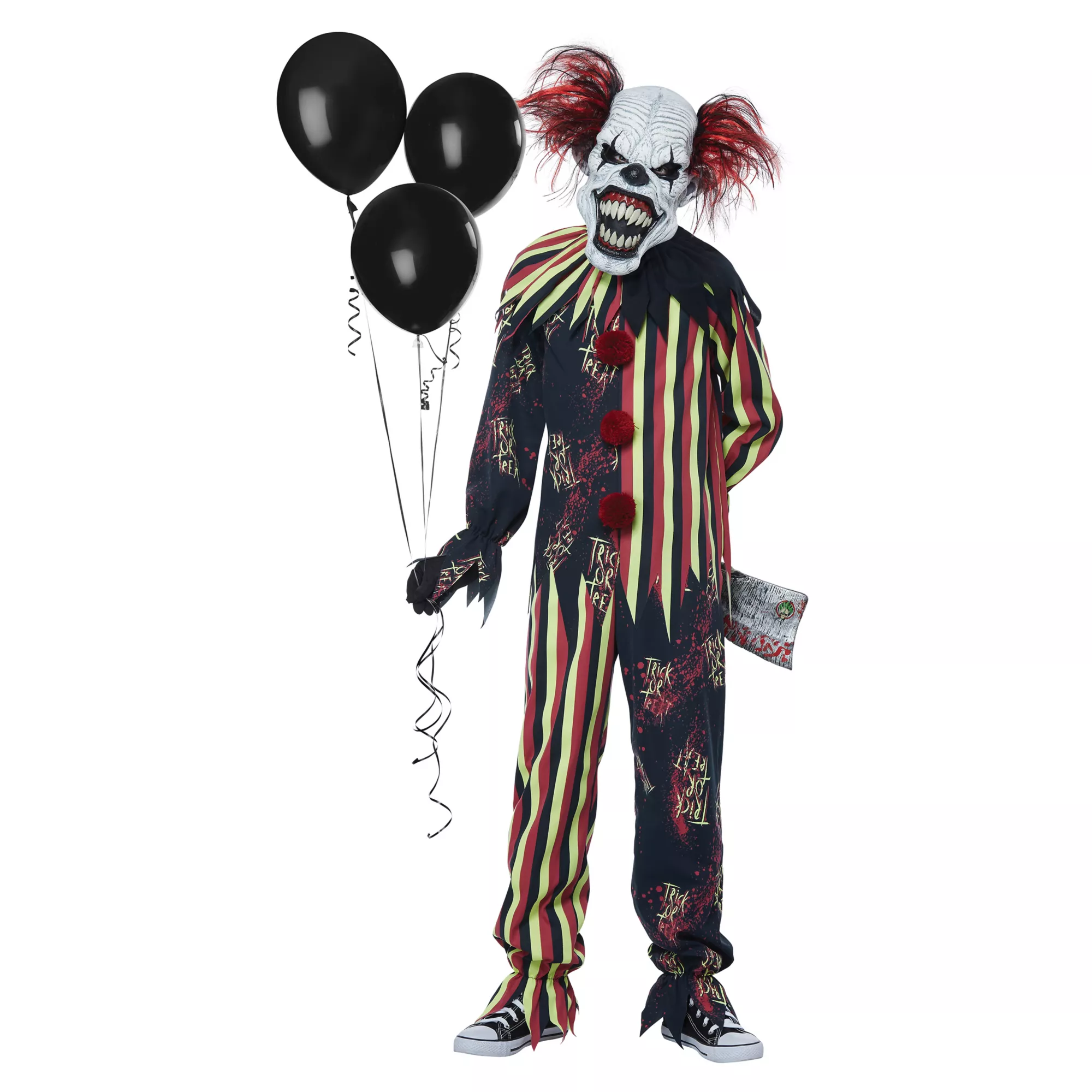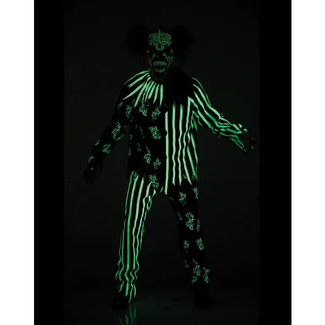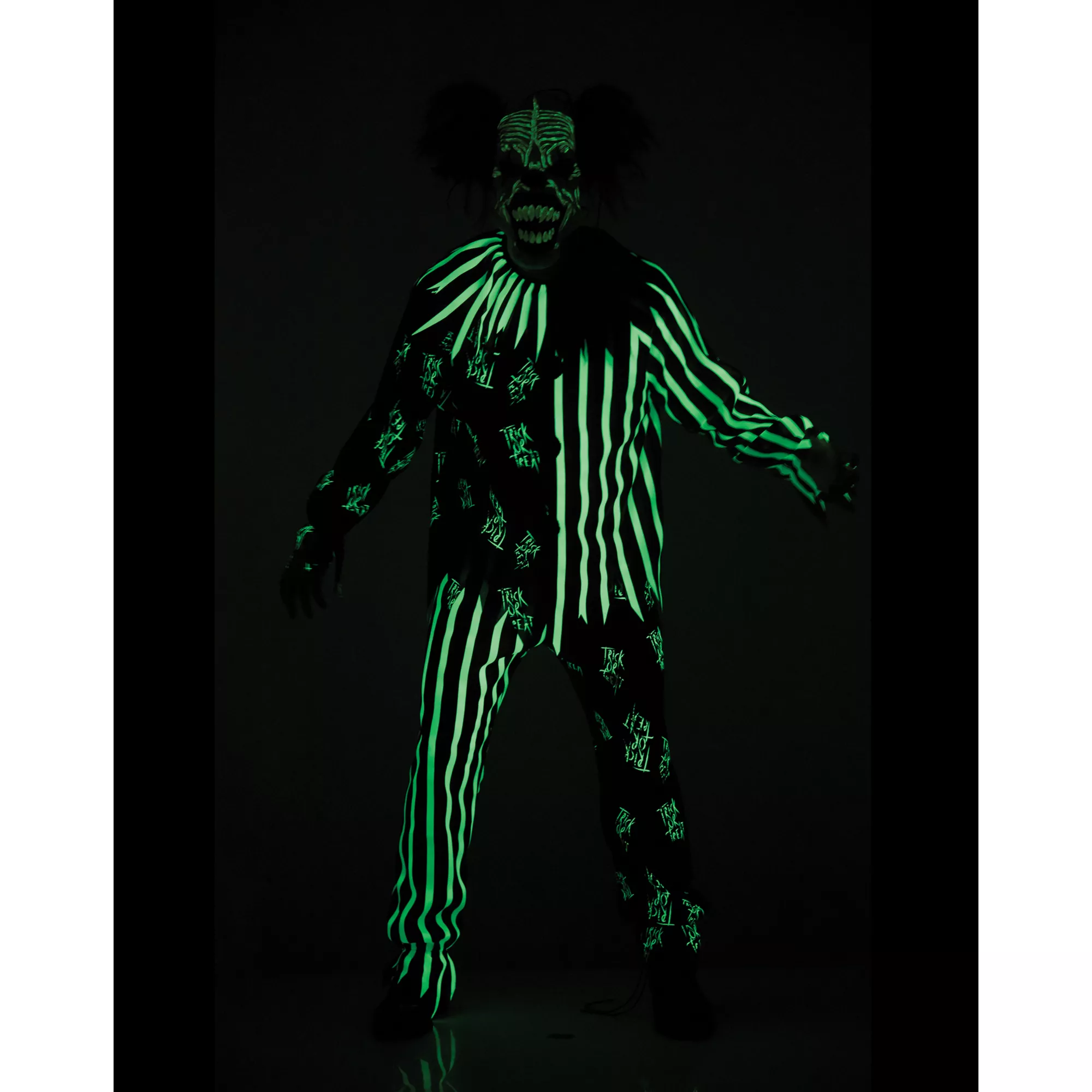 Bright up the night when you wear this horrifying glow in the dark clown costume! Hear screams wherever you go with this twisted and sinister clown mask, along with the black and red clown outfit with "trick or treat" details on one side of the shirt and pants. This creepy costume is sure to create memories for years to come...because it'll be in everyone's nightmares!