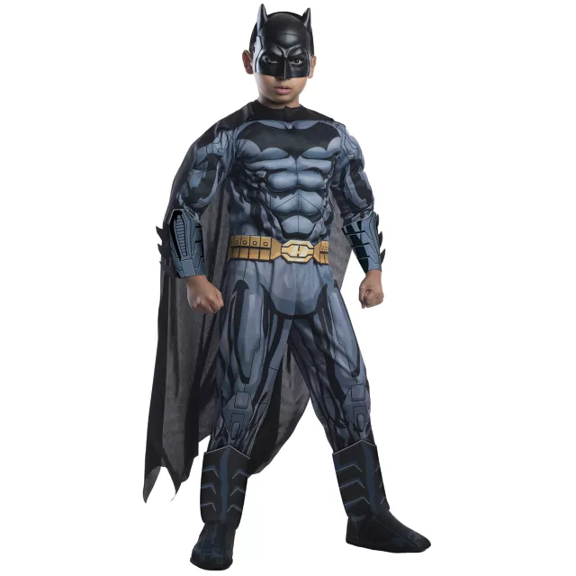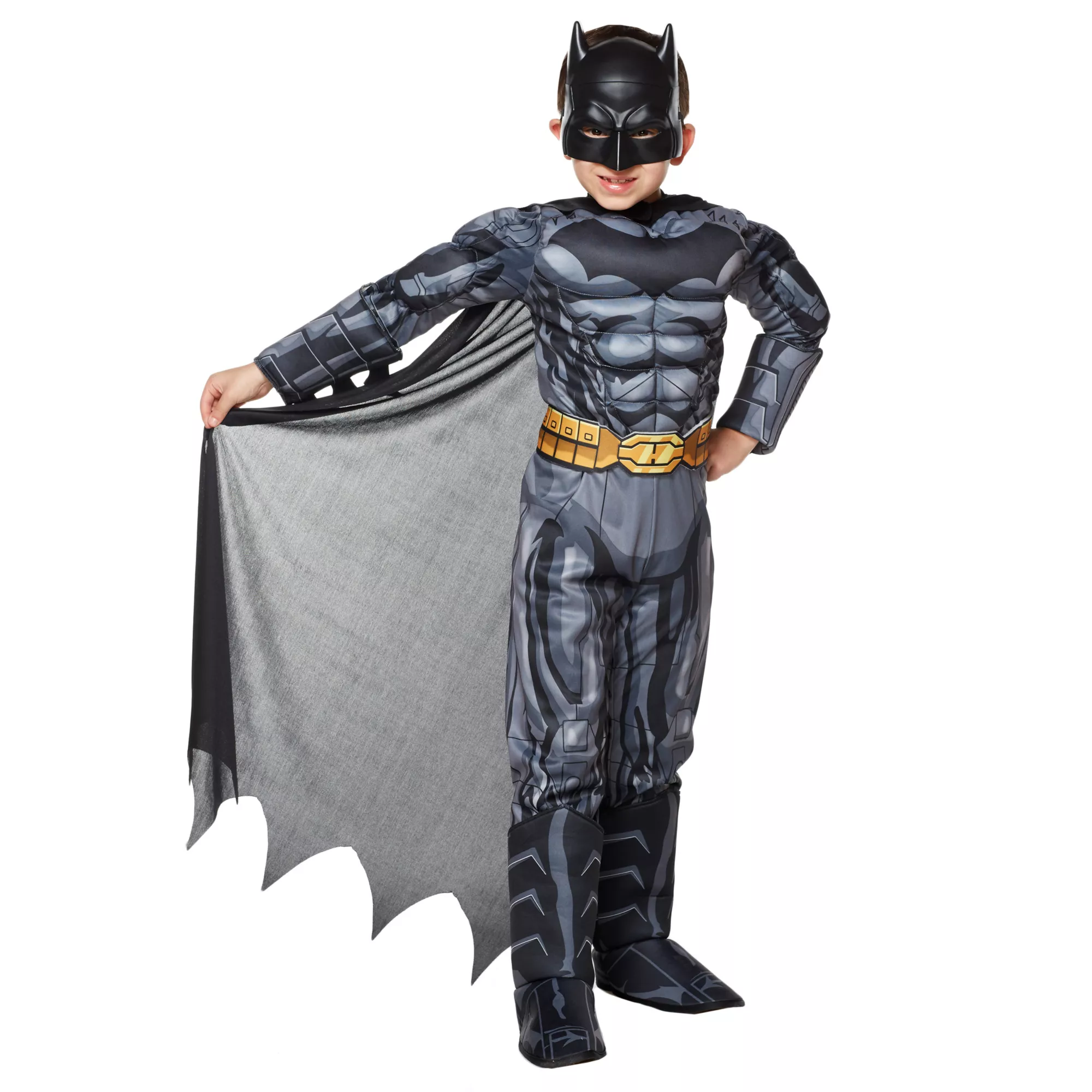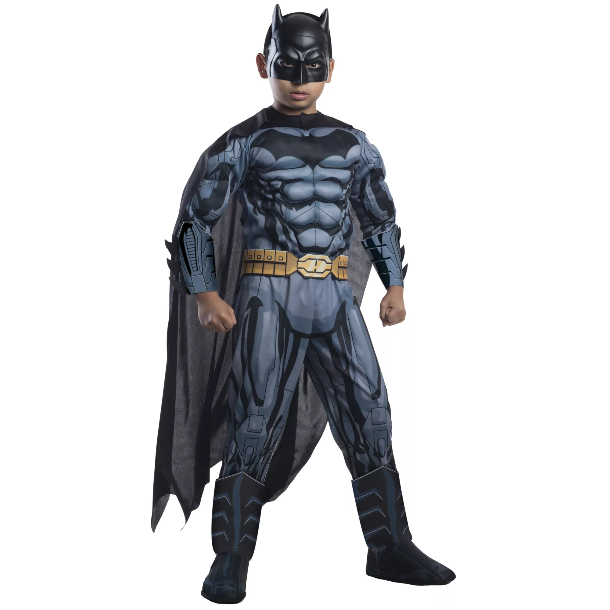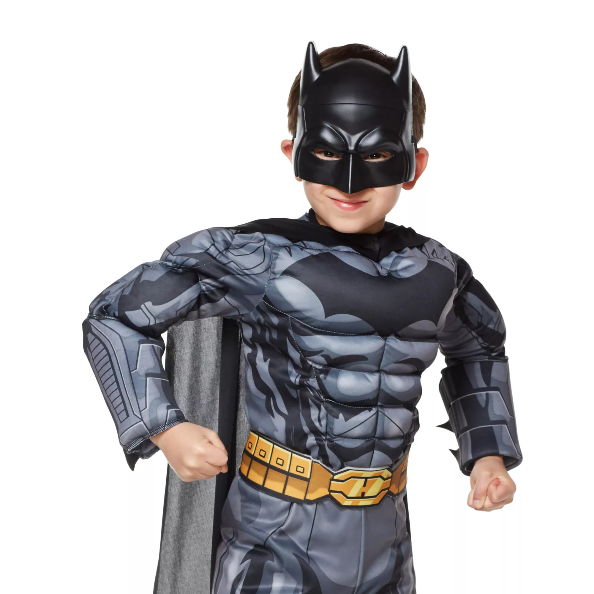 When villains lurk the streets of Gotham, you will be ready to save the city with this officially licensed 3D Grey and Black Batman Child Costume! Features blue muscle chest jumpsuit with dark blue muscle and armour graphic detailing as well as a dark blue Batman logo on the chest and 3D gaunlets and boot covers. Also includes golden graphic belt, grey cape, and black Batman mask!