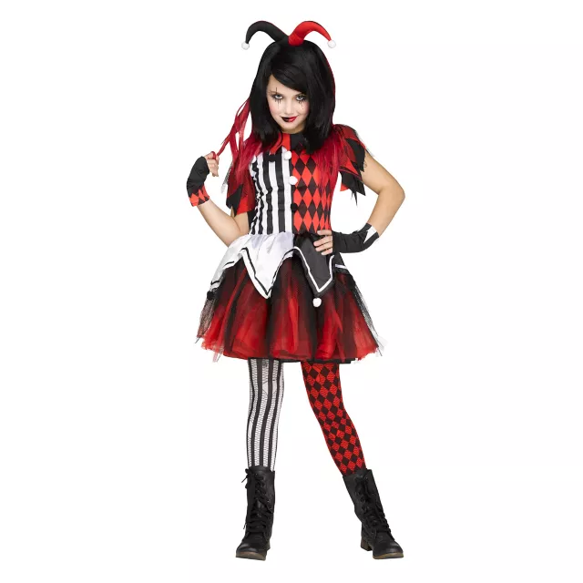 Take stylish and scary to a whole new level with this Horror Harlequin costume! The dress features a red and black design on one side of the chest and a white and black design on the other side, and the tutu flares out in red and black. This costume is perfect for any fabulously frightening harlequin!