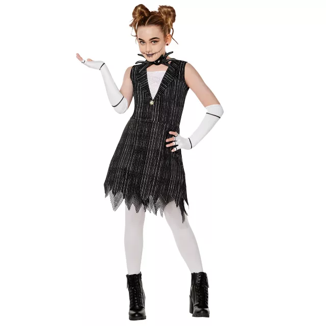 Channel your inner Pumpkin King with this officially licensed Kids Jack Skellington Dress Costume! Complete with a fit-and-flare black pinstripe dress, elbow-length gloves, and bow tie, this delightfully spooky ensemble is a must-have for lovers of all things Tim Burton.