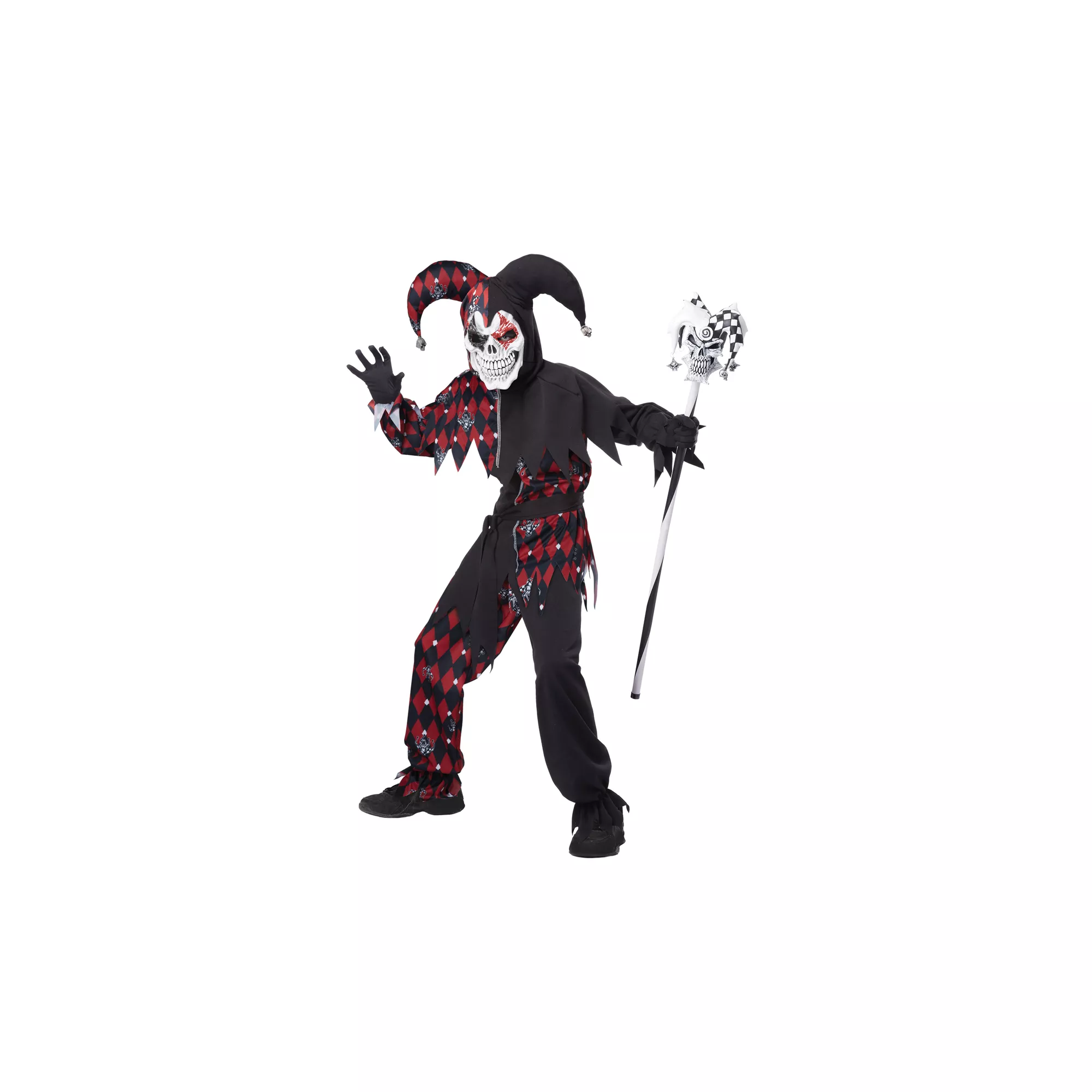 You'll have the last laugh in this terrifying jester costume! This red and black, harlequin-design outfit consists of a shirt, matching pants, waist sash, hood with attached collar and creepy jester mask. Looks like the joke is on you!