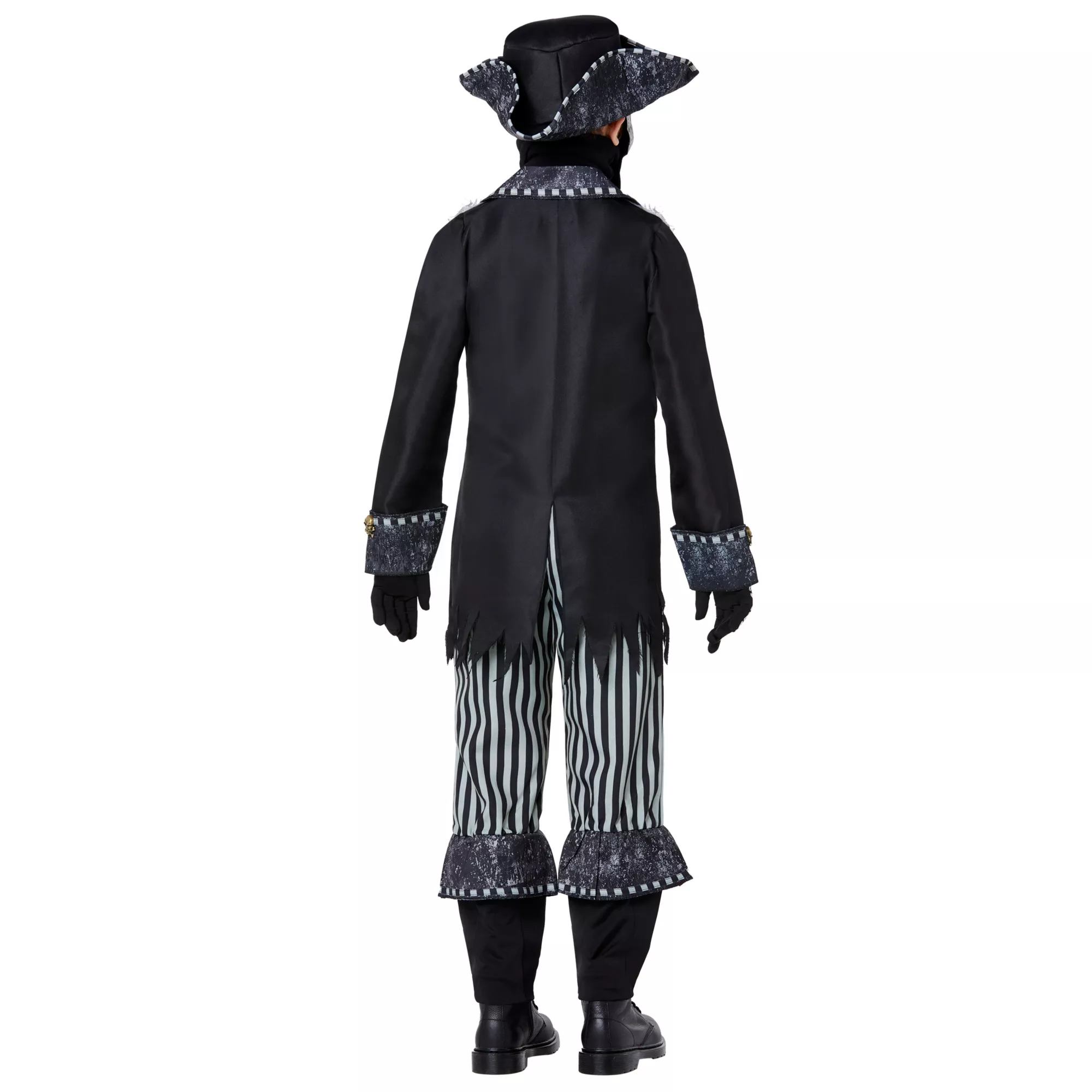 Transform into the deadliest pirate in history and haunt the seven seas when you wear this Kids Skeleton Pirate Costume this Halloween. Featuring a jacket with an attached skeleton shirt, pants, and a skull half mask, you'll be screaming "YO HO!" all Halloween long. Put on the included pirate hat and gloves to complete the look!