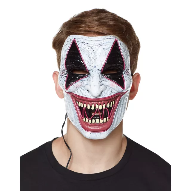 This murderous mask isn't clowning around. You won't want to find out why this creepy clown is smiling! The neon light trimmed eye and mouth details means that turning out the lights also turns up the terror from this sinister smiling menace.
